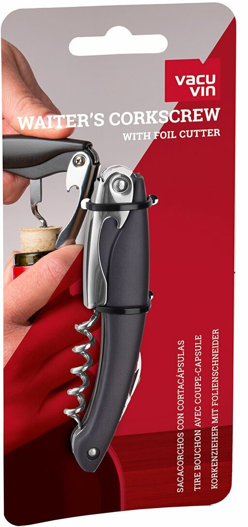 Штопор официанта для вина Vacu Vin - это элегантный многоцелевой штопор 3 в 1 для любого случая и любой ситуации. Многоцелевой инструмент сочетает в себе функции открывалки для винных бутылок, открывалки для обычных бутылок и резака для фольги, и подходит для удаления фольги с пробки, открытия винных пробок и пробок для бутылок. Этот штопор для винных бутылок и пробок, который выбирают сомелье, официанты и бармены.Vacu Vin – компания, основанная в 1986 году, занимающаяся инновационными разработками в области употребления и хранения вина и имеющая мировые патенты. А это значит, что ни одно другое предприятие не может выпускать аналоги товаров, разработанных фирмой. Так, компания разработала пробку для бутылок, создающую вакуум, что увеличивает срок хранения открытого вина. Качество и вкус напитка остаются неизменными в течение долгого времени. В ассортименте компании множество различных аксессуаров: рубашки для охлаждения вина, сумки для бутылок, вакуумные насосы и многое другое – одним словом все, чтобы сделать употребление вина максимально "правильным". У компании множество мировых наград в области революционных технологий. Для производства Vacu Vin использует материалы только премиального качества. Изделия этого бреда оценили люди уже из 80 стран мира, одной из которых, к счастью, является Россия.