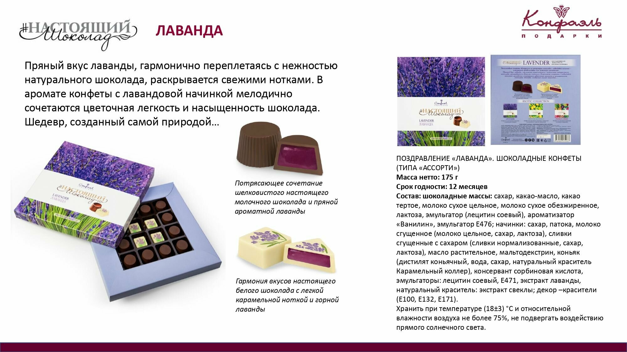 На сегодняшний день товар «Шоколадные конфеты типа "Ассорти" Поздравление "Лаванда". 175 г Конфаэль» можно купить с кешбеком в 1 магазине: Яндекс.Маркет