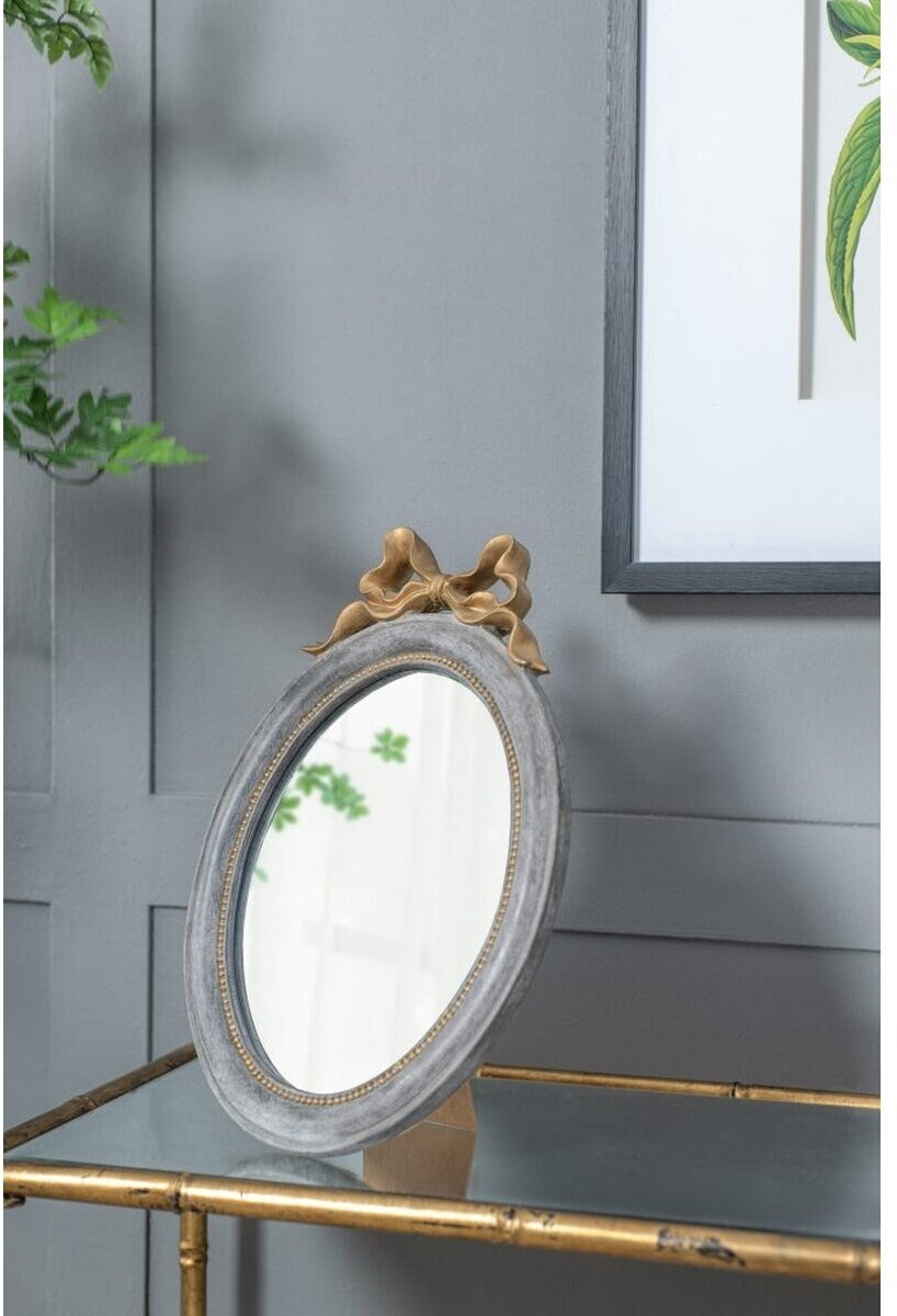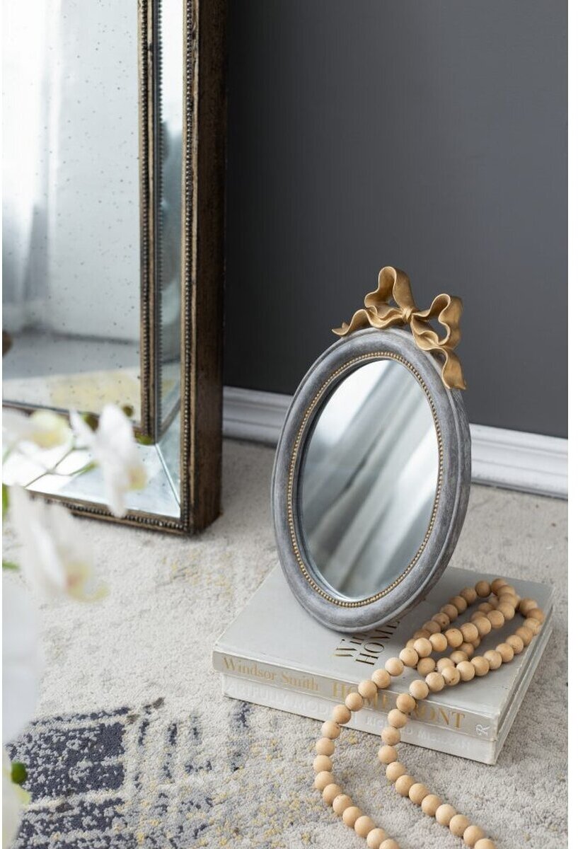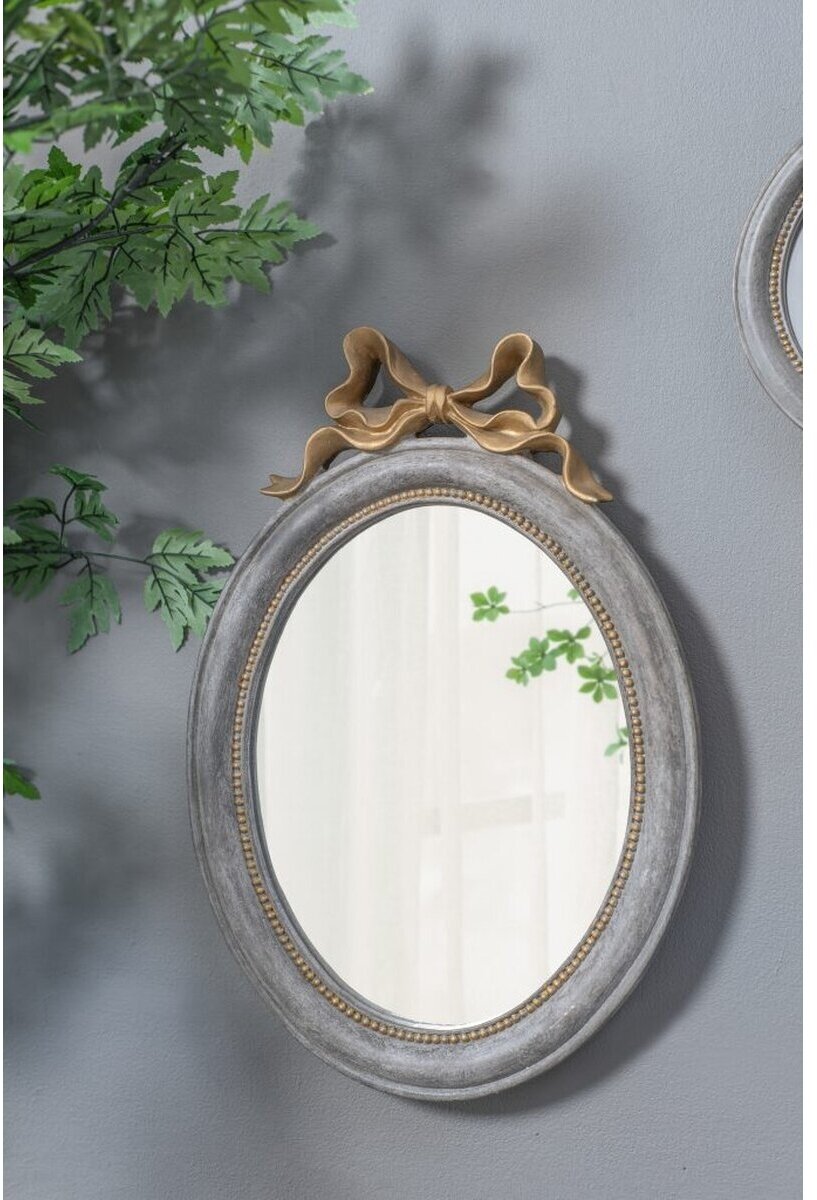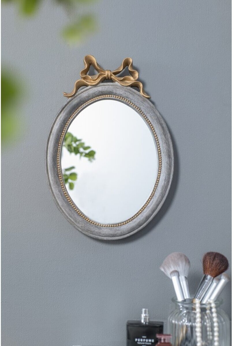 Это овальное зеркало сразу бросается в глаза очаровательным орнаментом в виде банта. Это изделие выполнено в цветах сланцево-серый и винтажное золото - сочетание, которое хорошо смотрится с различными темами декора в классическом стиле. Повесьте это зеркало отдельно или как часть настенной художественной композиции.