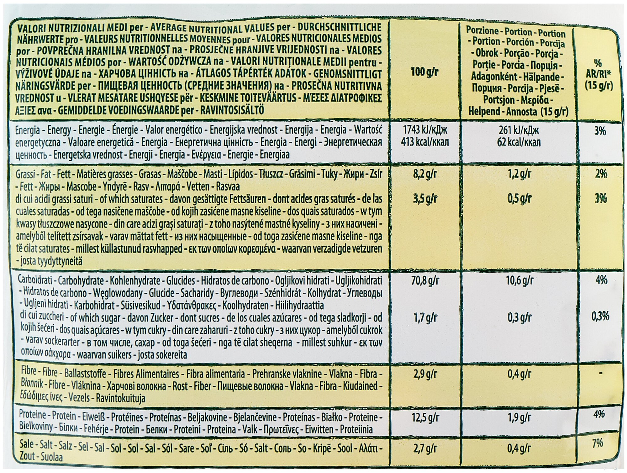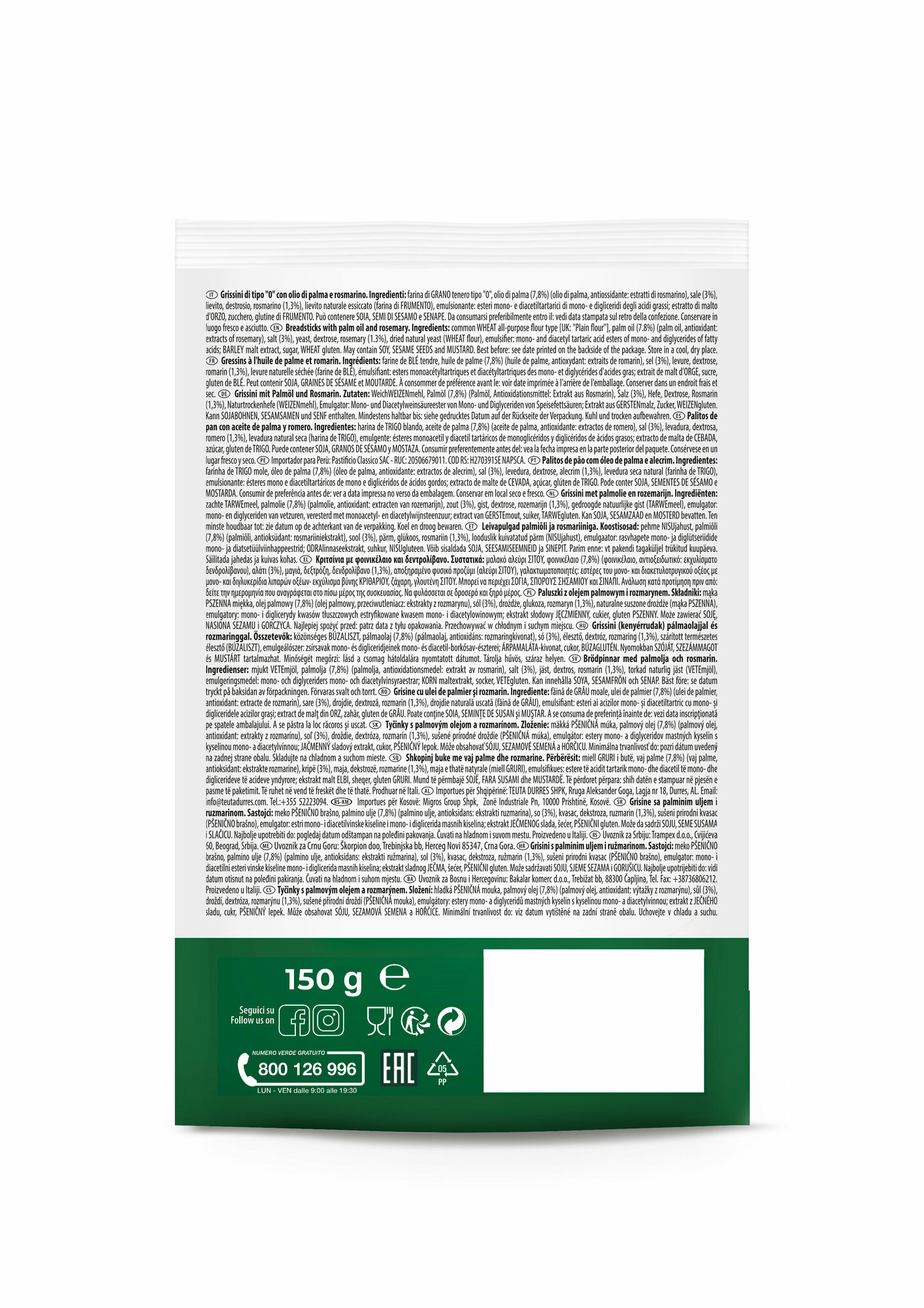 | Состав | Мука из мягких сортов пшеницы тип 0, пальмовое масло 6,6%, дрожжи, соль, декстроза, солодовый экстракт, розмарин 0,5%. Эмульгаторы: Е472f. |