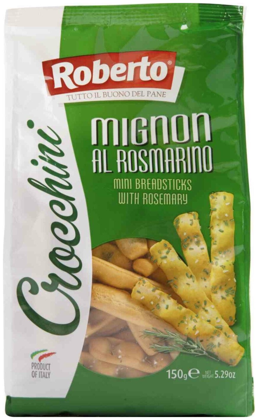 Хлебные палочки "Гриссини Кроккини" с розмарином "Roberto" великолепны в качестве аперитива или легкого перекуса. Подходят для диетического питания. Компания "Roberto Alimentare S.r.l." основана в 1962 году. Сочетание традиций качественного производства хлеба с самыми современными технологиями и потребностями рынка и безграничная любовь к своему делу принесли компании "Roberto Srl" известность и популярность во многих странах мира. Сегодня компания Roberto Alimentare s.r.l. - признанный лидер в Италии в сегменте производства хлебобулочных изделий с долей рынка по некоторым группам товаров более 30%. Компания "Roberto" стремится обеспечить высокий уровень механизации и автоматизации технологических процессов производства хлеба, внедрение новых технологий и постоянное расширение ассортимента хлебобулочных изделий. Уважаемые клиенты! Обращаем Ваше внимание на возможные изменения в дизайне упаковки. Поставка осуществляется в зависимости от наличия на складе.