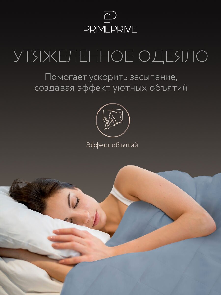 Утяжеленное одеяло «» бренда PRIME PRIVE 140х205 см состоит из чехла и наполнителя. Верх чехла — из 100% велюра, низ чехла — из искусственного меха. Внешний наполнитель — из 100% полиэстера, внутренний наполнитель — из стеклянных гранул. Утяжеленное одеяло «» — это одеяло, которое содержит утяжеленные гранулы, оказывающие сильное, но мягкое давление на все тело в равной степени, способствуя отдыху и расслаблению. Многие описывают ощущение от утяжеленного одеяла как похожее не объятие: комфортно, тепло, мягко и уютно. Основа конструкции — наполнитель из полиэстера со стеклянными гранулами размером около 1 мм, которые делают одеяло более тяжелым, основательным. Они изготовлены из специального сверхпрочного и экологически чистого стекла. Наполнитель из гранул соответствует международным стандартам качества и безопасности OEKO-Tex Standard. Благодаря утеплителю из холлофайбера, одеяло обладает отличной терморегуляцией: под ним комфортно спать в любое время года. Одеяло «» отличается от остальных утяжеленных одеял чехлом: верхняя сторона изготовлена из нежного велюра, а нижняя — из пушистого искусственного меха. Такая комбинированная ткань обладает важными свойствами: она прочная, износостойкая, гипоаллергенная и приятная на ощупь. Двусоставной разнофактурный материал помогает активировать сенсорное восприятие предмета, улучшая тактильные ощущения. Стирать одеяло рекомендуется на самом щадящем режиме при температуре не более 40 °C и слабом отжиме. Сушить его лучше всего разложенным на горизонтальной поверхности или повешенным вертикально. Утяжеленные одеяла помогают улучшить качество сна и снизить уровень тревожности, так как давление помогает расслабиться, успокаивает и стабилизирует пульс, снимает стресс и облегчает засыпание. В исследовании шведских ученых 2020 года 120 добровольцев с депрессией, биполярным и тревожным расстройствами и СДВГ (синдром дефицита внимания и гиперактивности) на протяжении месяца использовали утяжеленные одеяла. Обнаружилось, что симптомы депрессии (а также слабости и тревожности) у них стали слабее.