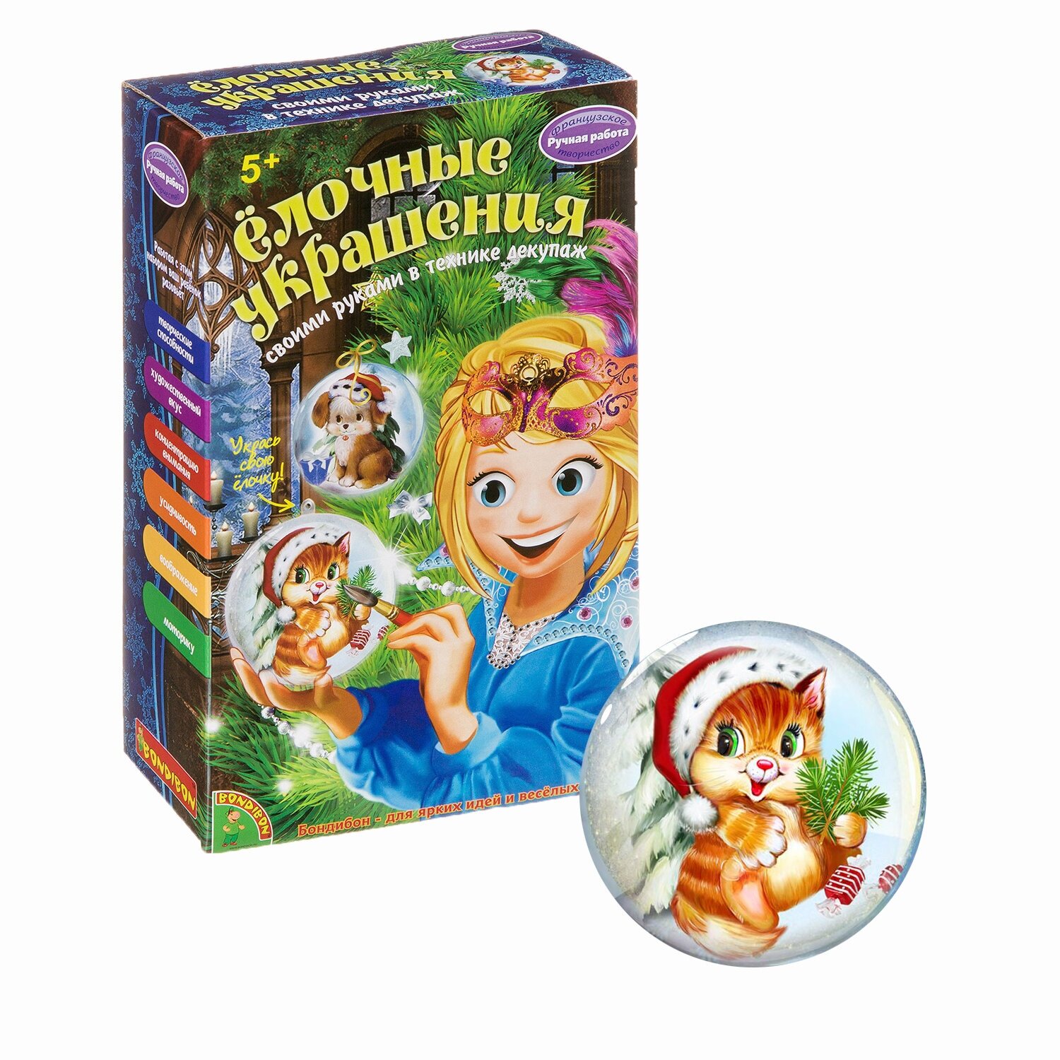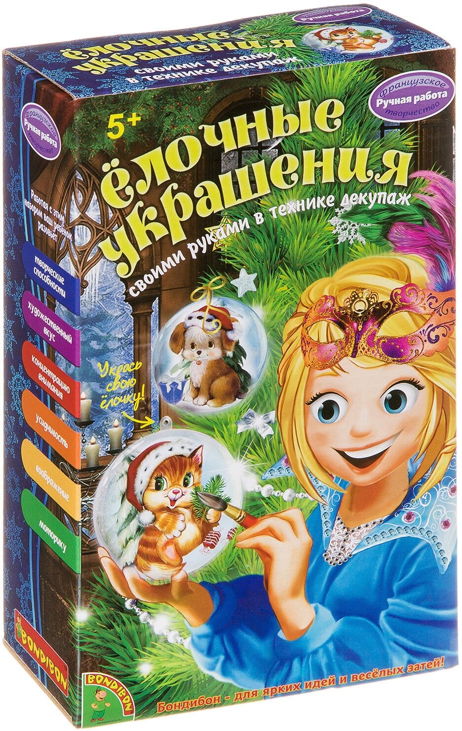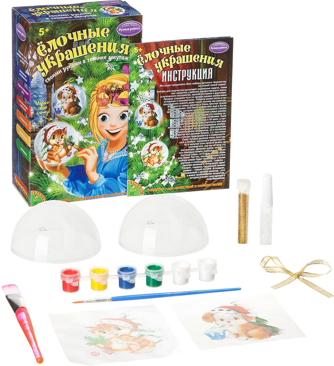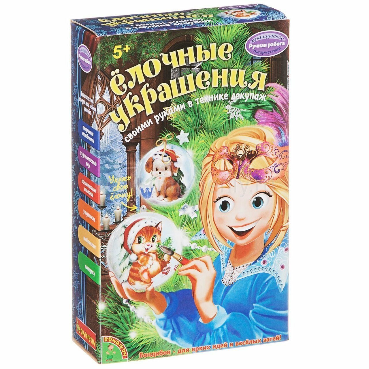 BONDIBON Набор для творчества Ёлочные украшения - комплект, который поможет юному дизайнеру освоить новую технику оформления - декупаж. В комплекте находится все необходимое для реализации своих креативных идей, а указания инструкции подскажут, как оформить два шарика наиболее красиво и аккуратно. Готовые работы рукодельница сможет украсить разноцветными красками, которые смогут добавить презентабельности законченной работе.