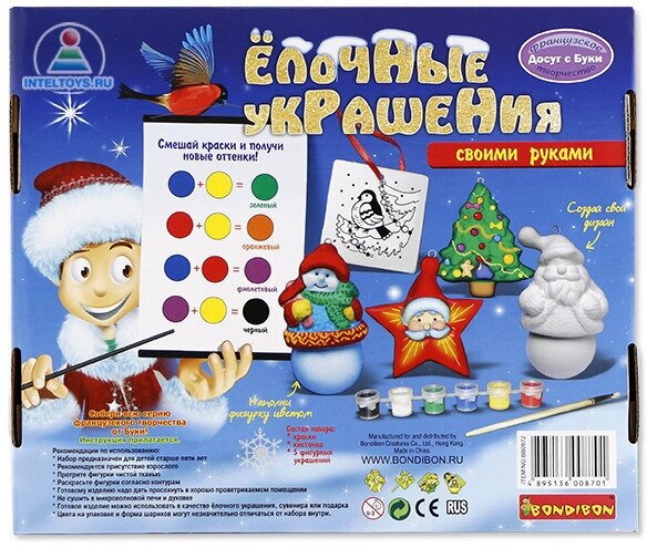 Атмосферу новогоднего праздника так приятно создавать вместе со своими детьми. Ведь в первую очередь этот праздник, конечно же для них! А вы помните, какие игрушки на вашей елке знакомы вам с самого вашего детства? А теперь представьте, что ваш ребенок вместе с вами создал сам новогоднюю игрушку, которая будет из года в год украшать вашу красавицу - елку. А когда-нибудь уже взрослый сын или взрослая дочь, самостоятельно наряжая новогоднее дерево, вспомнит: «Мама, а помнишь, как мы делали эту игрушку? Она же с самого моего детства на елке!» Вот именно для такой цели и существует набор для творчества BONDIBON «Ёлочные украшения» - увлекательный набор для детского творческого досуга. Раскрашивать изделия из керамики - очень интересно и увлекательно. Готовые расписные керамические фигурки станут прекрасным украшением любого интерьера или замечательным подарком для близких и друзей. Процесс раскрашивания помогает развить творческие способности, усидчивость, внимательность, самостоятельность, координацию движений. Создать праздник вместе с ребенком вдвойне приятно!