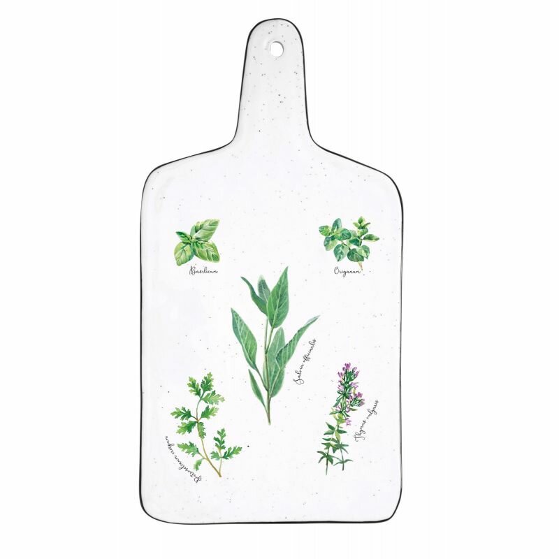 Посуда " Herbarium" представлена множеством разнообразных предметов, необходимых как для сервировки стола, так и для приготовления пищи. Она выполнена в виде винтажной эмалированной посуды. Основной цвет сочетается с " потертостями" цвета темного железа. Сервировочная доска " Herbarium" изготовлена из белого фарфора и украшена изображениями трав с подписями. Белый фон контрастирует с изображениями зеленого цвета и темными надписями и окантовкой края. Подходит для подачи разнообразных нарезок. Небольшая ручка поможет при перемещении. Есть отверстие для подвешивания. Идеально сочетается с другими предметами коллекции. С посудой коллекции " Herbarium" итальянского бренда " Easy Life" сервировка Вашего стола никогда не будет обычной!
