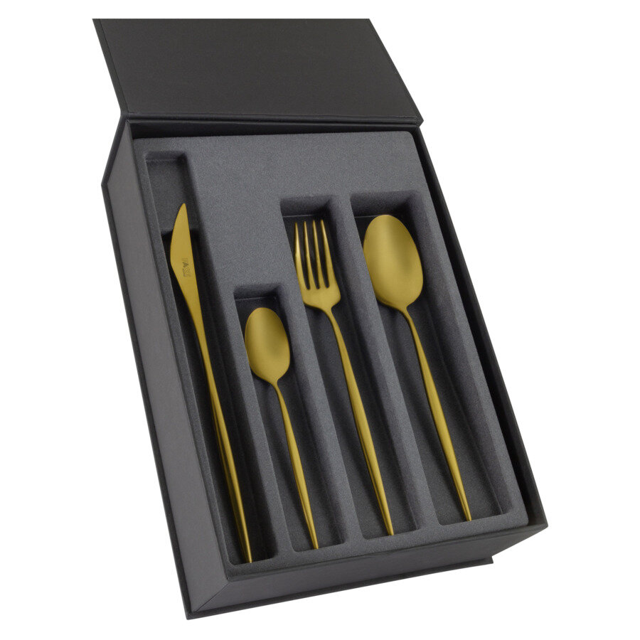 Коллекция столовых приборов португальской компании FACE пополнилась изделиями с покрытием на основе технологии PVD(Physical Vapour Deposition – напыление покрытия в вакууме, при котором покрытие получается путем прямой конденсации пара наносимого материала).Этот метод нанесения одного металла на другой заключается в переводе металла в газообразное состояние и последующей его конденсации на другой металл. Процесс происходит в вакуумной камере и предоставляет возможность получения различных цветовых оттенков. Кроме того, в результате нанесения покрытия происходит дополнительная защита столовых приборов от царапин и против коррозии, увеличивая срок их службы.Три новых покрытия – золотое, медное и черное в популярной коллекции Cosmos – отличное и стильное дополнение к сервизам, выполненным в современном стиле.Наборы столовых приборов FACE соответствует высоким требованиям качества, прочности и надежности, отличаются изысканным и современным дизайном.Столовые приборы FACE - прекрасное решение для сервировки стола, выгодное приобретение для дома и замечательный подарок.Набор столовых приборов Cosmos PVD Gold Матовый состоит из 24 предметов цвета золота. Рассчитан на 6 персон, в набор входит 6 столовых ложек, 6 столовых вилок, 6 столовых ножей, 6 чайных ложек. Приборы бережно упакованы в подарочную коробку для удобства хранения.
