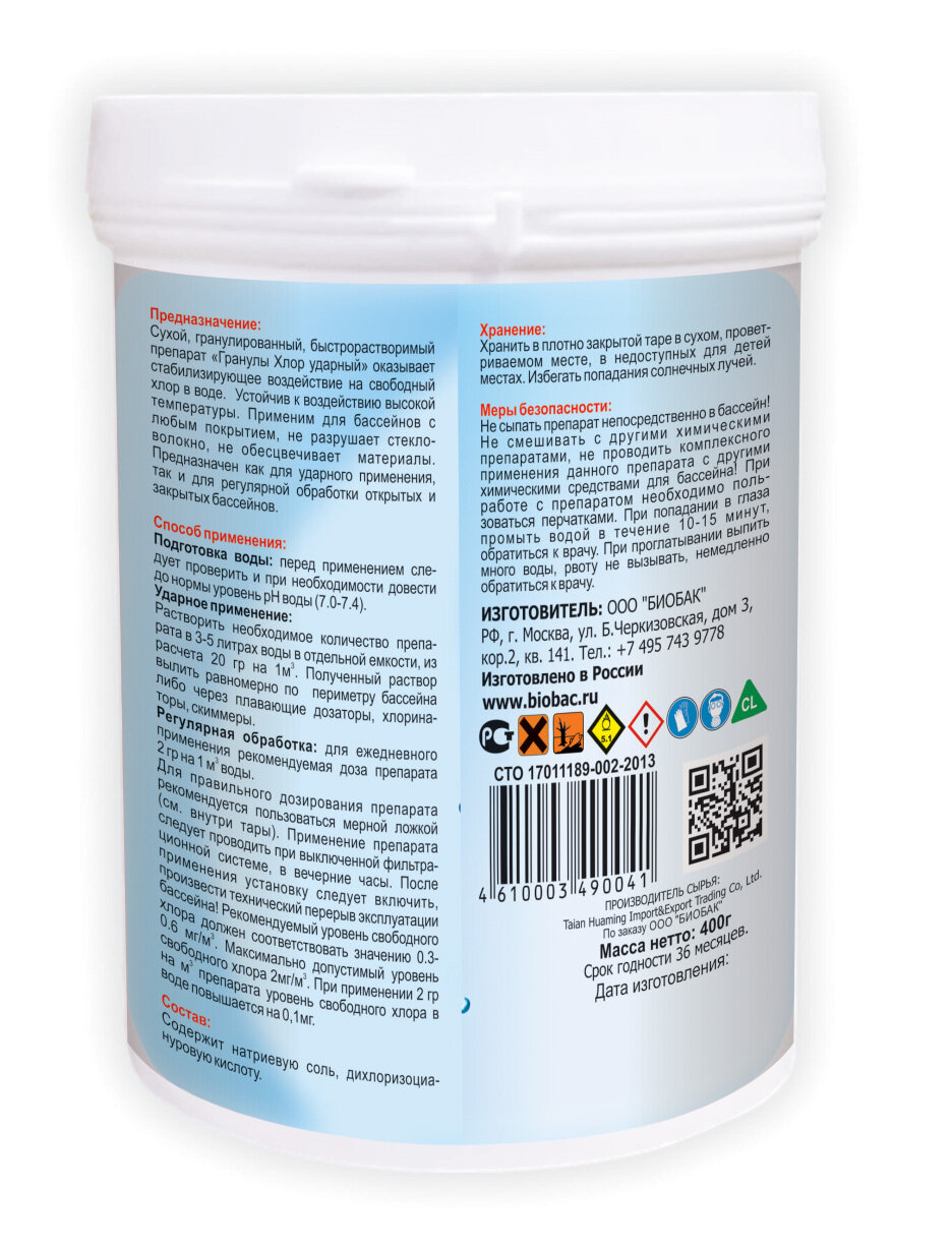 Средство для дезинфекции БиоБак Хлор Ударный 400 гр. BP-C400 подходит для открытых и закрытых бассейнов. Используется для дезинфекции воды. Эффективно удаляет бактерии и грибки.