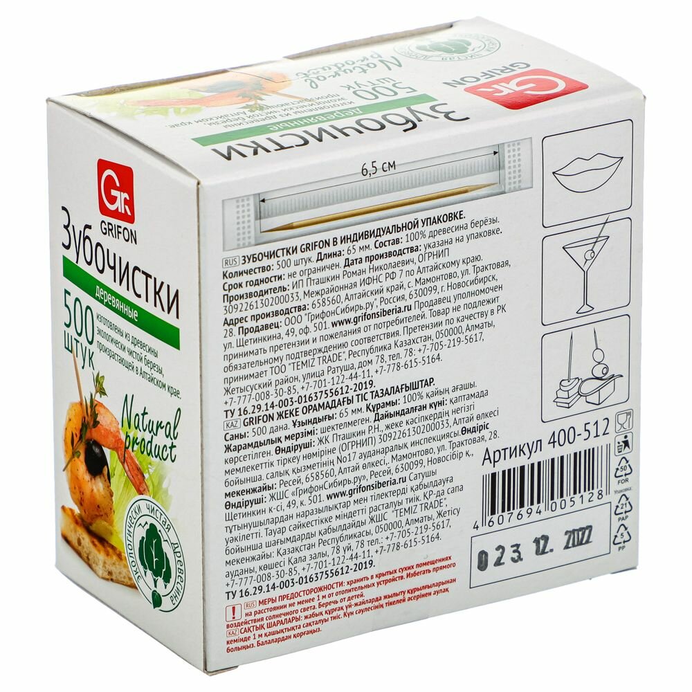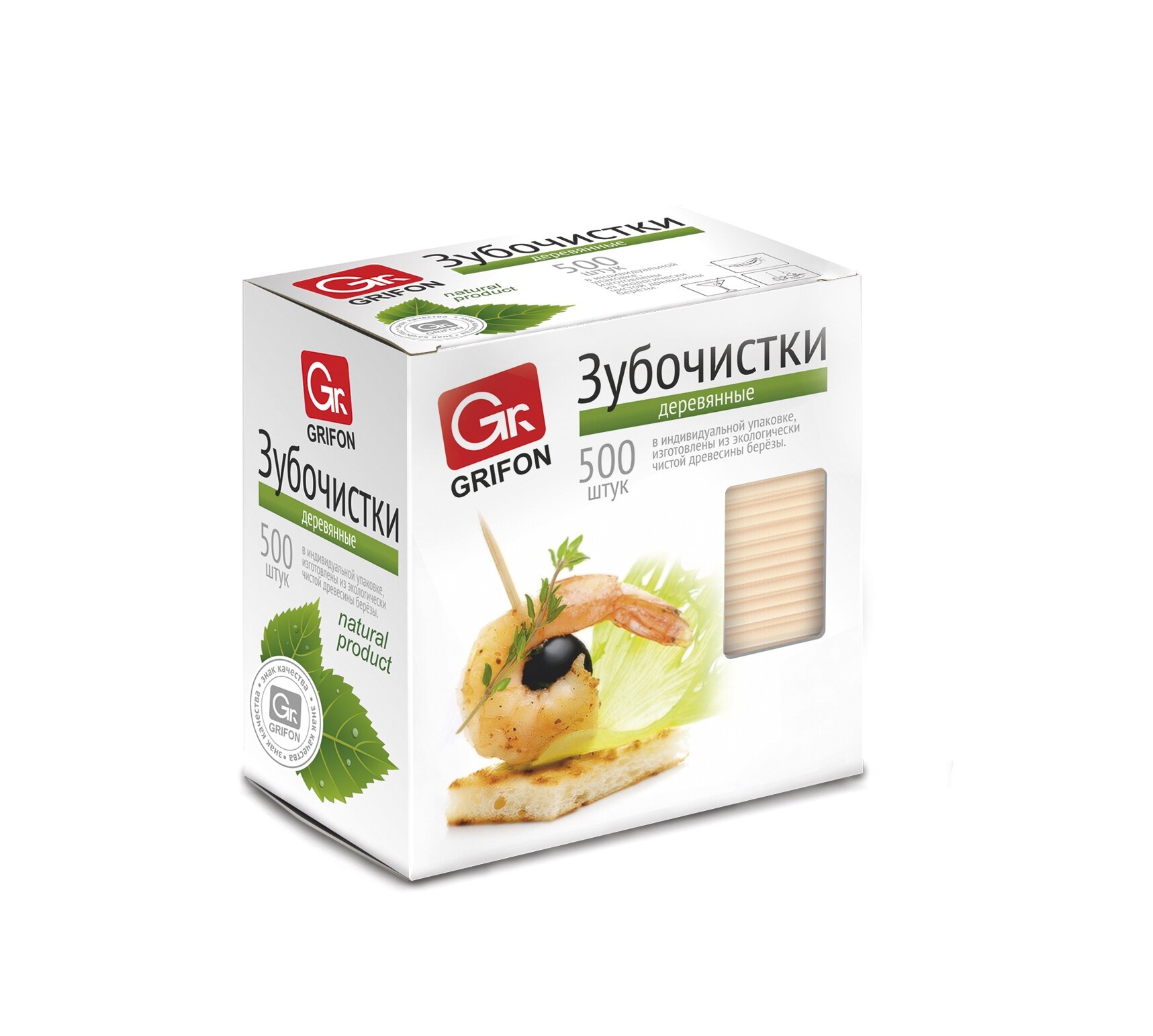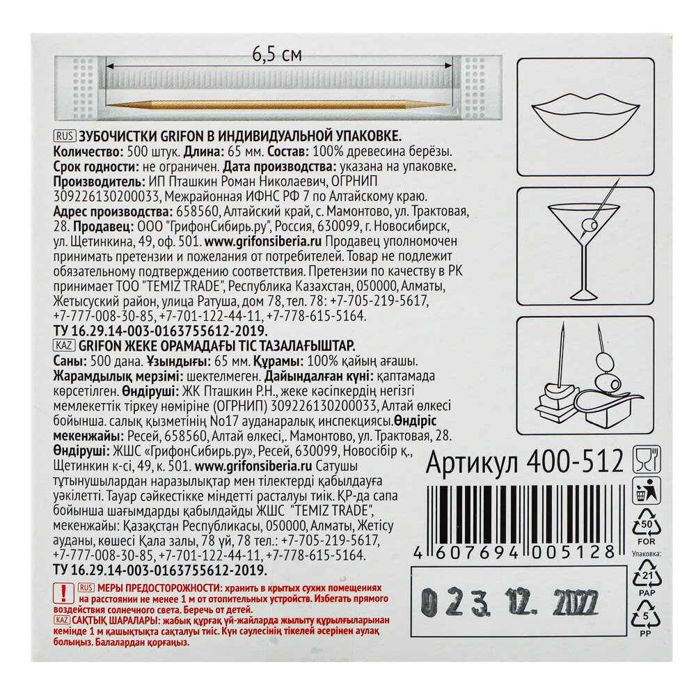 Зубочистки Grifon в индивидуальной упаковке береза 500 шт