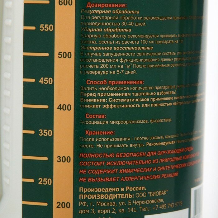 Очень хороший, качественный, эфективный и очень концетрированный (очищает до 30м3) биосостав Биобак для очистных систем, септиков, выгребных ям и дачных туалетов. Использовал для очистки двух септиков по 15м3. Через 3 недели после использования практически пропал неприятный запах, пропала жировая плёнка и тёмные плавающие сгустки.