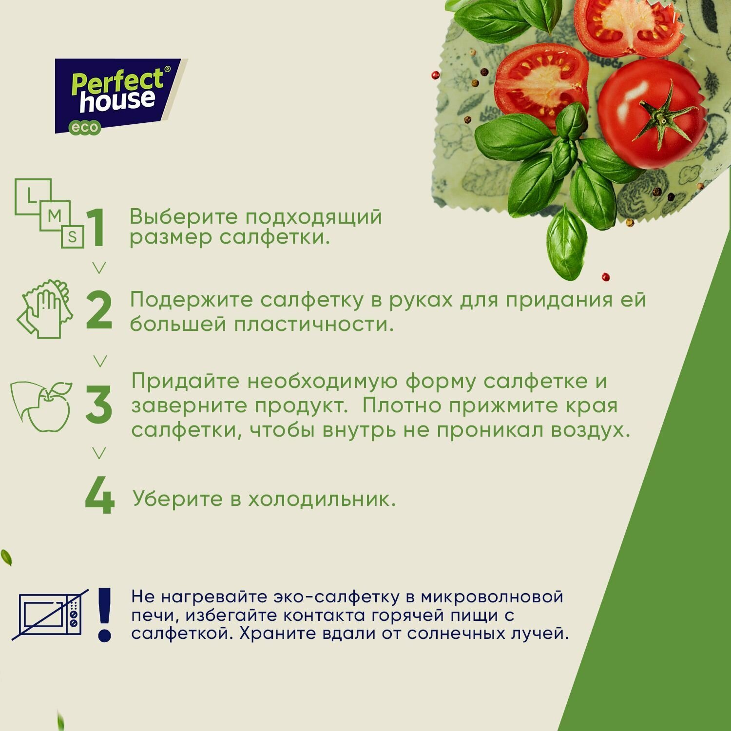 Многоразовая салфетка с пчелиным воском для хранения продуктов сохраняет естественную влагу, свежесть и вкусовые качества, препятствует появлению плесени. В восковой эко салфетке можно хранить свежий хлеб, зелень, сыр, колбасу, овощи или фрукты, бургеры или сэндвичи. Эта многоразовая упаковка станет экологичной альтернативой пищевой плёнке или фольге. Накройте салфеткой для хранения продуктов тарелку с салатом, фаршем или супом, согрейте её руками и пригладьте к стенкам посуды. Под действием тепла салфетка принимает любую форму. Салфетка торговой марки Perfect House серии Eco Line многоразовая, срок службы до 1 года. Для повторного использования восковую салфетку необходимо ополоснуть прохладной водой, не застирывая, можно мыть с мылом, а после - просушить полотенцем.Салфетка Natural Beeswax создана из натурального хлопка, пропитанного специальным составом из пчелиного воска, масла жожоба и древесной смолы. В упаковке одна салфетка, размер 31*31 см. Perfect House - эксперт в деталях.