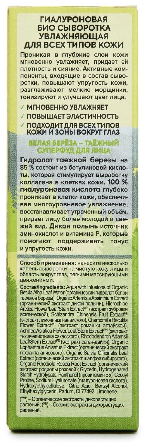 ГИАЛУРОНОВАЯ БИО СЫВОРОТКА ДЛЯ ЛИЦА DEEP MOISTURE УВЛАЖНЯЮЩАЯ ДЛЯ ВСЕХ ТИПОВ КОЖИ Проникая в глубокие слои кожи мгновенно увлажняет, придает коже плотность и сияние. Активные компоненты, входящие в состав сыворотки, повышают упругость кожи, разглаживают мелкие морщинки, тонизируют и улучшают цвет лица. Мгновенно увлажняет Повышает эластичность Подходит для всех типов кожи и области вокруг глаз БЕЛАЯ БЕРЁЗА – ТАЁЖНЫЙ СУПЕРФУД ДЛЯ ЛИЦА Гидролат таежной березы на 85 % состоит из бетулиновой кислоты, которая стимулирует выработку коллагена в клетках кожи. 100 % гиалуроновая кислота глубоко проникает в клетки кожи, обеспечивая многоуровневое увлажнение, восстанавливает утраченный объём, придает лицу более молодой и свежий вид. Дикая полынь источник аминокислот и витамина Р, которые помогают поддерживать тонус и упругость кожи.