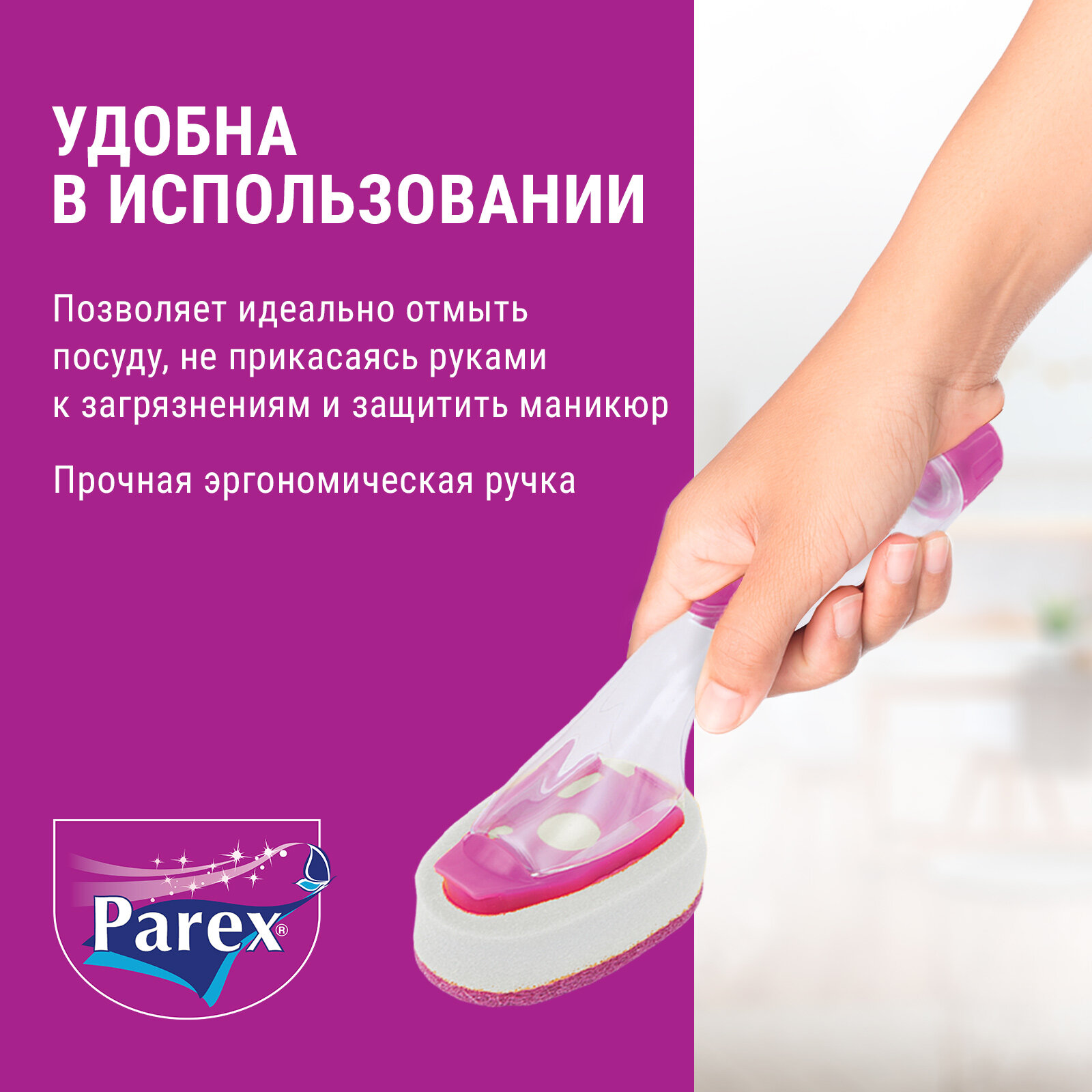 Губка для уборки и мытья посуды Parex с дозатором для моющего средства позволяет идеально отмыть посуду и различные поверхности, не прикасаясь руками к загрязнениям и защитить маникюр.Вы можете одновременно выполнять процедуру очищения и использования моющего средства.Обеспечивает длительное использование, благодаря съемной насадке.Губка с резервуаром для средства удобна в использовании благодаря прочной эргономичной ручке.В упаковке 1 губка с дозатором для моющего средства. Сменная насадка продается отдельно.