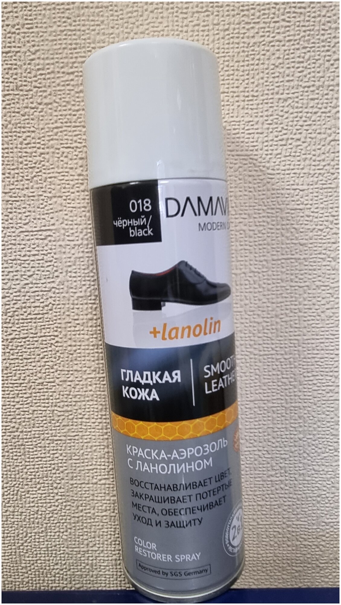 | Способ применения | Перед нанесением рекомендуется проверить на незаметном участке обрабатываемого изделия. Баллон сильно встряхнуть. Распылять равномерно на сухую и очищенную поверхность с расстояния 15−20 см в хорошо проветриваемом помещении несколько секунд. Внутреннюю часть обуви и ранты подошвы другого цвета перед применением закрыть. Дать высохнуть примерно 60 мин. Применять регулярно. Насыщенность цвета регулируется количеством слоев нанесения краски, больше слоев — темнее цвет. Не использовать для замшевой кожи. |