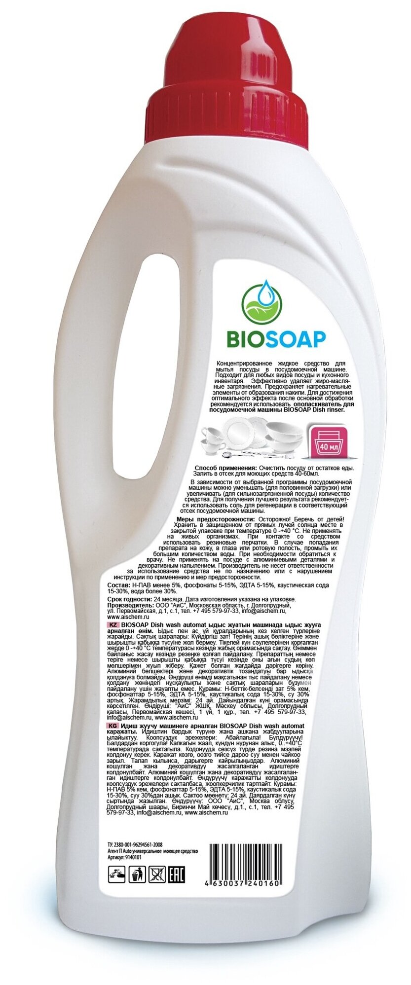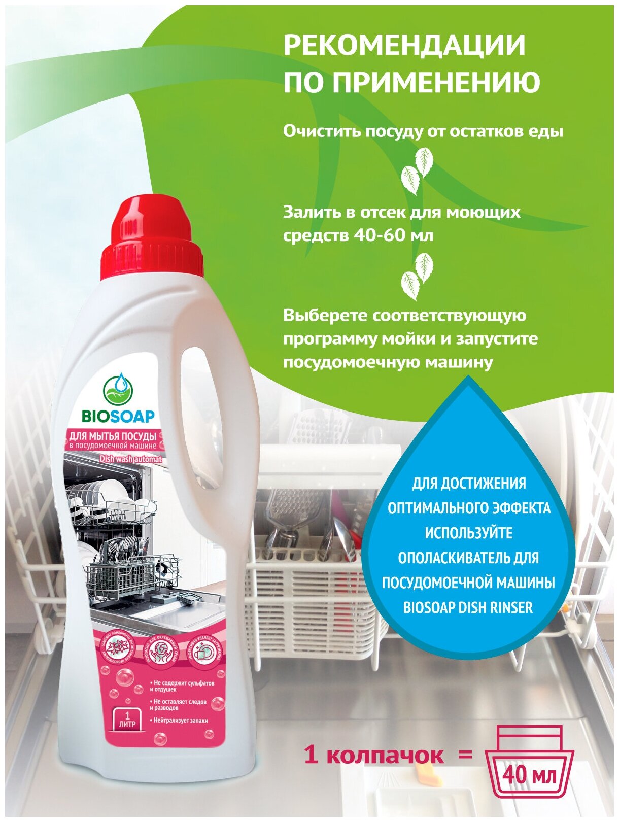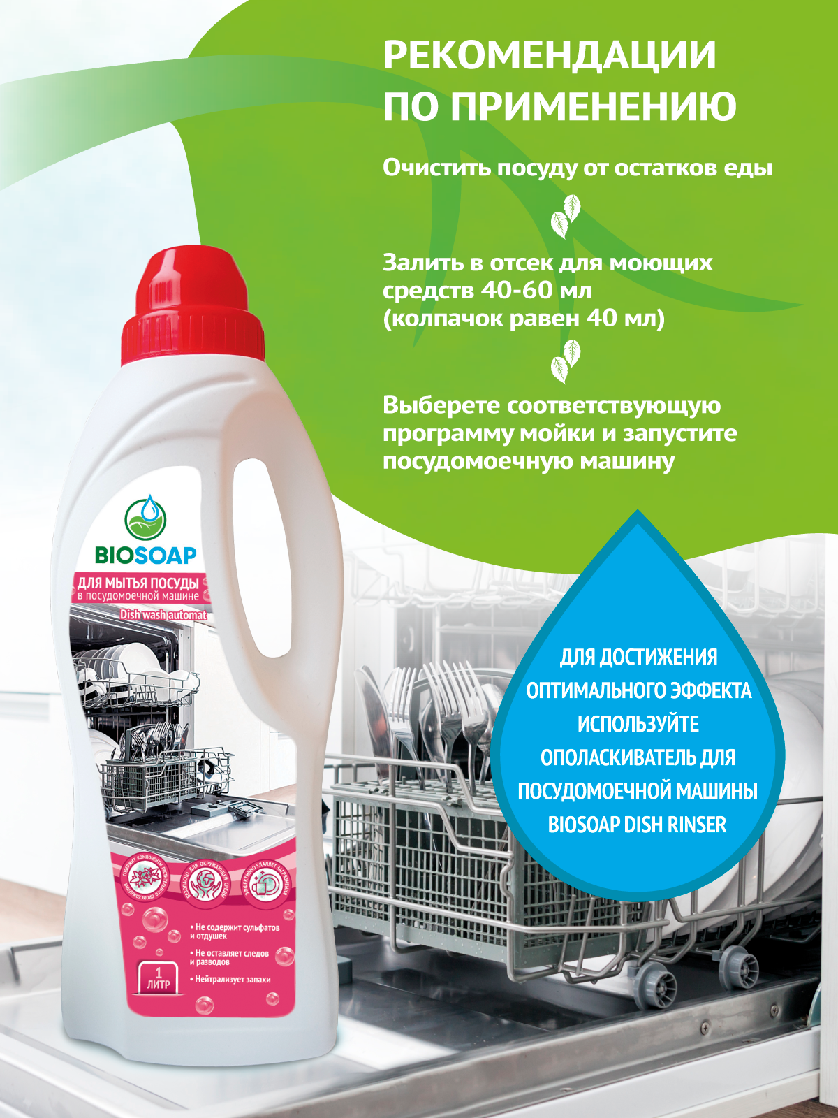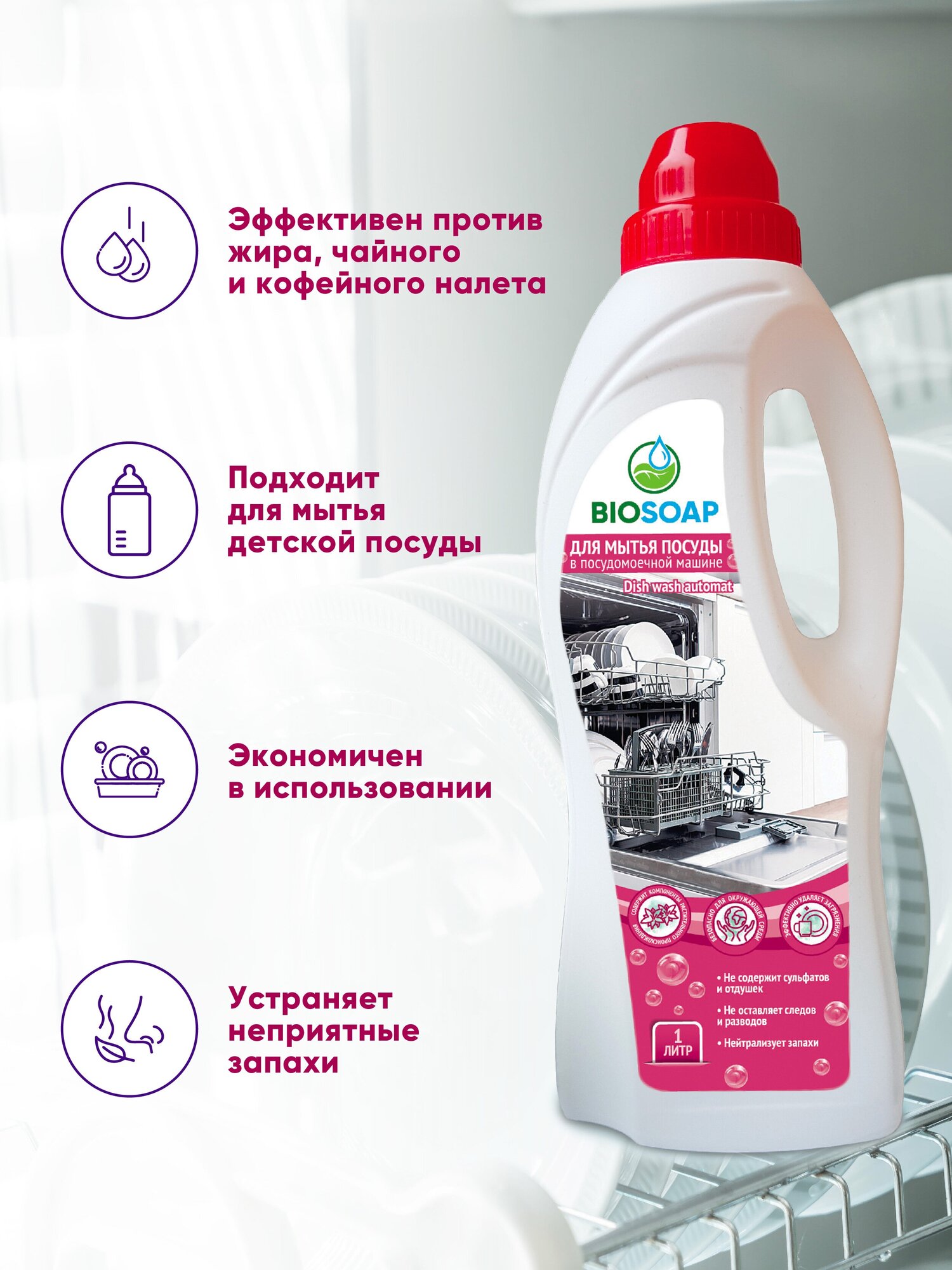 Концентрированное жидкое средство для мытья посуды в посудомоечной машине. Подходит для любых видов посуды и кухонного инвентаря. Эффективно удаляет жиро-масляные загрязнения. Предохраняет нагревательные элементы от образования накипи. Для достижения оптимального эффекта после основной обработки рекомендуется использовать Ополаскиватель для посудомоечной машины BIOSOAP Dish rinser. Содержит компоненты растительного происхождения.Не содержит сульфатов и отдушек. Эффективно удаляет загрязнения. Не оставляет следов и разводов. Нейтрализует запахи. Безопасно для окружающей среды.