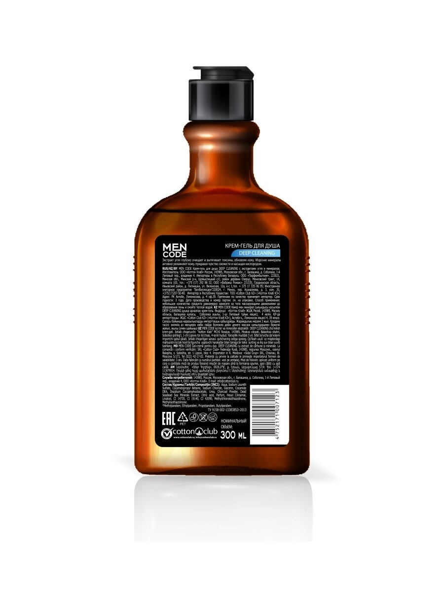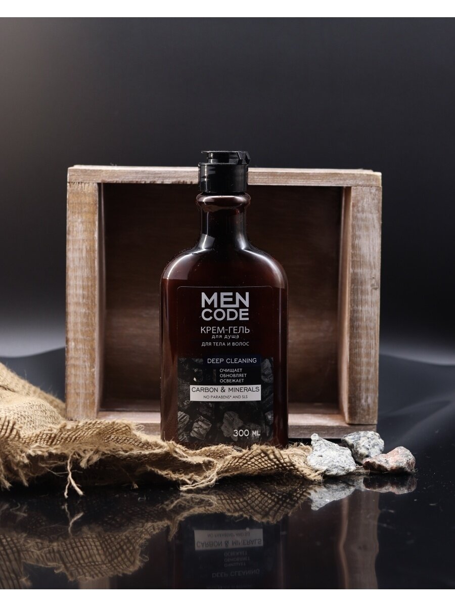 Крем-гель для душа MEN CODE DEEP CLEANING с экстрактами угля и минералов интенсивно очищает и обновляет мужскую кожу, придавая чувство свежести, и обеспечивает ежедневный уход. - Экстракт древесного угля выводит токсины и нормализует pH-баланс кожи. - Морские минералы насыщают кожу кислородом и питательными веществами, а также увлажняют и освежают кожу. Инновационная формула с максимальной концентрацией ценных природных экстрактов и ингредиентов. - Запоминающийся и притягательный аромат. - Поддерживает здоровый и ухоженный вид кожи. - Не содержит парабены и SLS.