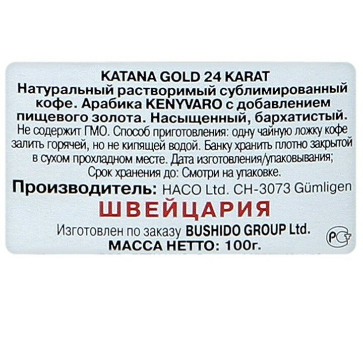 BUSHIDO Katana Gold 24 Karat Растворимый кофе Мы добавили кусочки пищевого золота лишь для того, чтобы подчеркнуть уже имеющуюся роскошь вкуса BUSHIDO Katana Gold 24 Karat: коричная обжарка зерен 100%-ной арабики с плантаций Экваториальной Африки довела до совершенства все фруктово-винные оттенки этого кофе. Вкусовой профиль: Фруктовый, винный. Сбалансированный и сладкий. Регион произрастания зерен: Экваториальная Африка Оптимальная температура воды при заваривании растворимого кофе — 93-95°С.У продукции BUSHIDO изменилась внутренняя мембрана: фольгированный материал заменен на более плотную мембрану, имеющую конструкцию (язычок) для более удобного ее удаления. Изменения упаковки производственные и не связаны со сменой производителя.