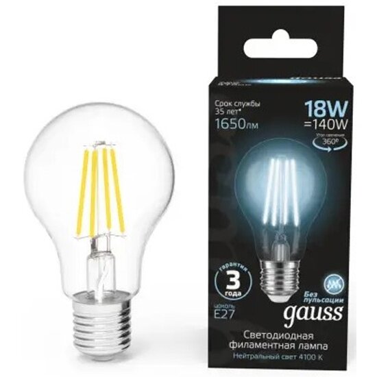 На сегодняшний день товар «Gauss Лампа Filament А60 18W 1650lm 4100К Е27 LED 1/10/40 102902218» можно купить с кешбеком в 1 магазине: Яндекс.Маркет