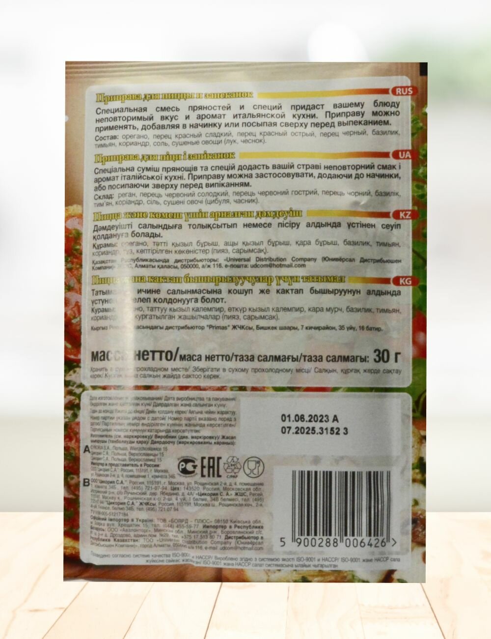 | Состав | орегона, перец красный сладкий, перец красный острый, перец черный, базилик, тимьян, кориандр, соль, сушеные овощи (лук, чеснок) |