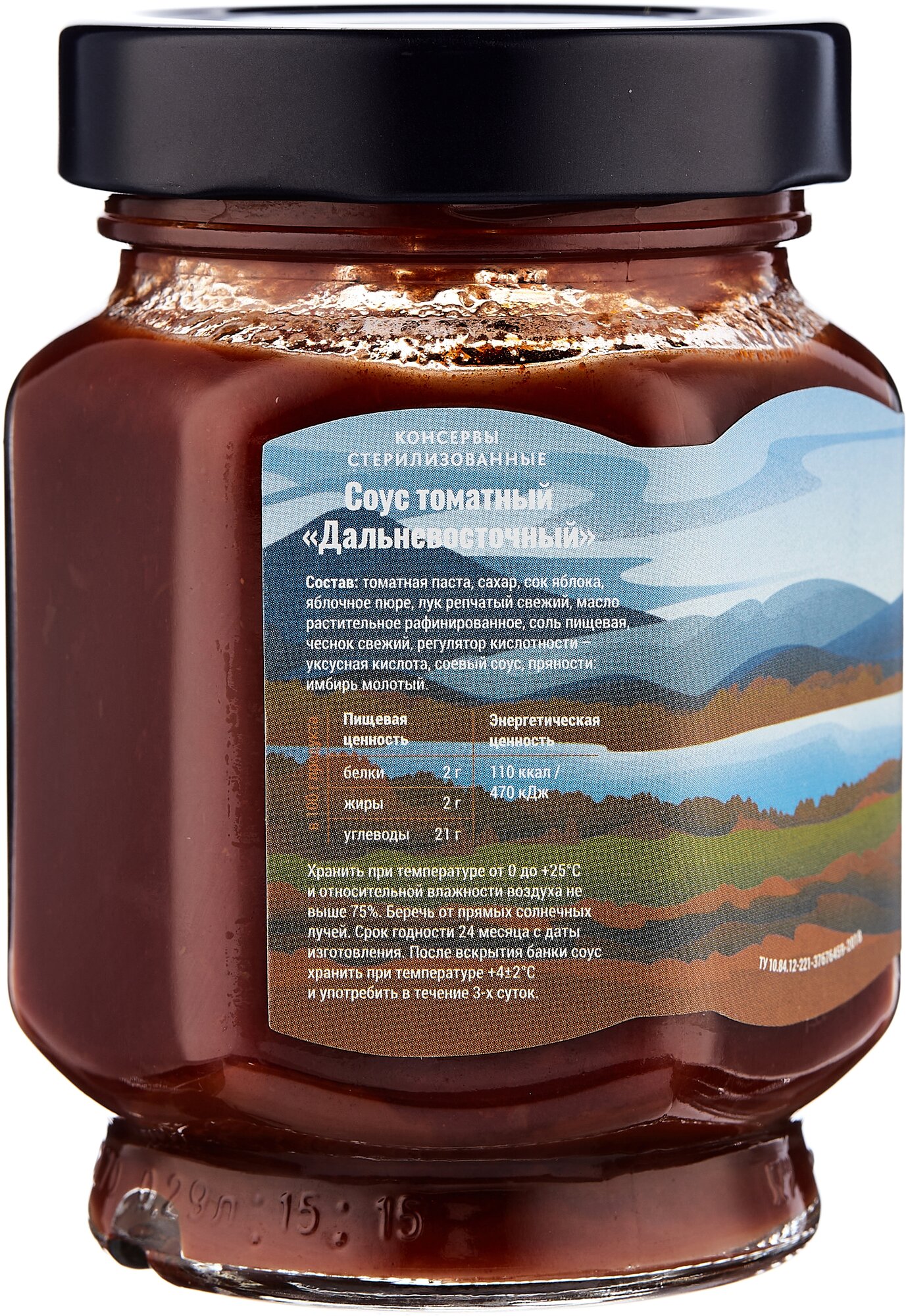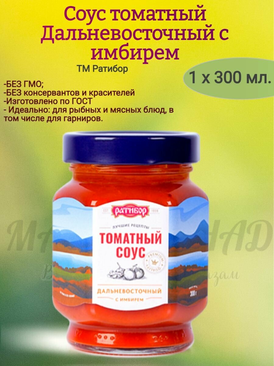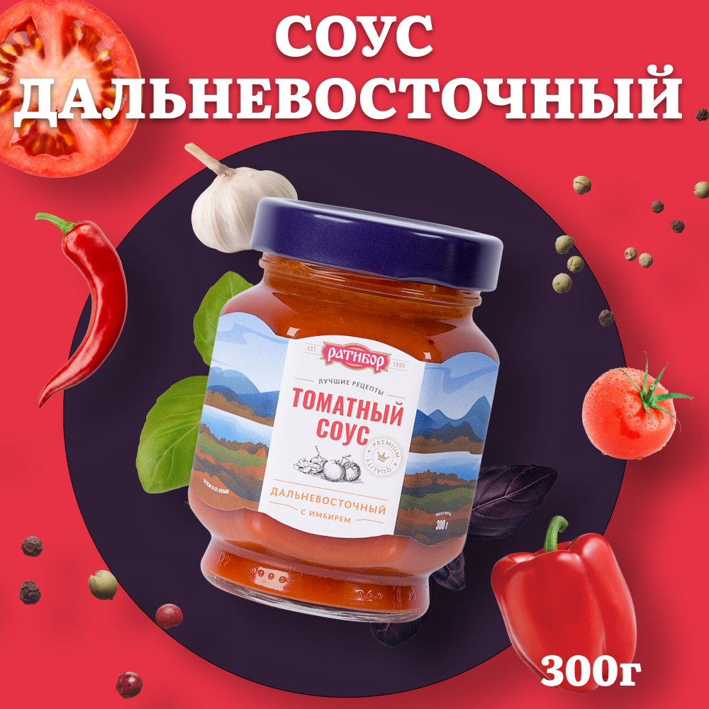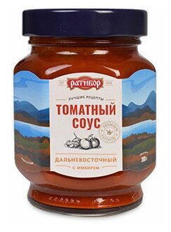 Соус томатный Дальневосточный с имбирем, Ратибор. Для особого повода и просто так. В этом соусе объединен классический вкус спелых томатов, а также ароматные пряности и специи. Соус с легкой кислинкой и яркими нотами имбиря прекрасно подойдёт к вашим любимым блюдам из мяса или овощей. Состав: томатная паста, сахар, сок яблока, яблочное пюре, лук репчатый свежий, масло растительное рафинированное, соль пищевая, чеснок свежий, регулятор кислотности – уксусная кислота, соевый соус, пряности: имбирь молотый.