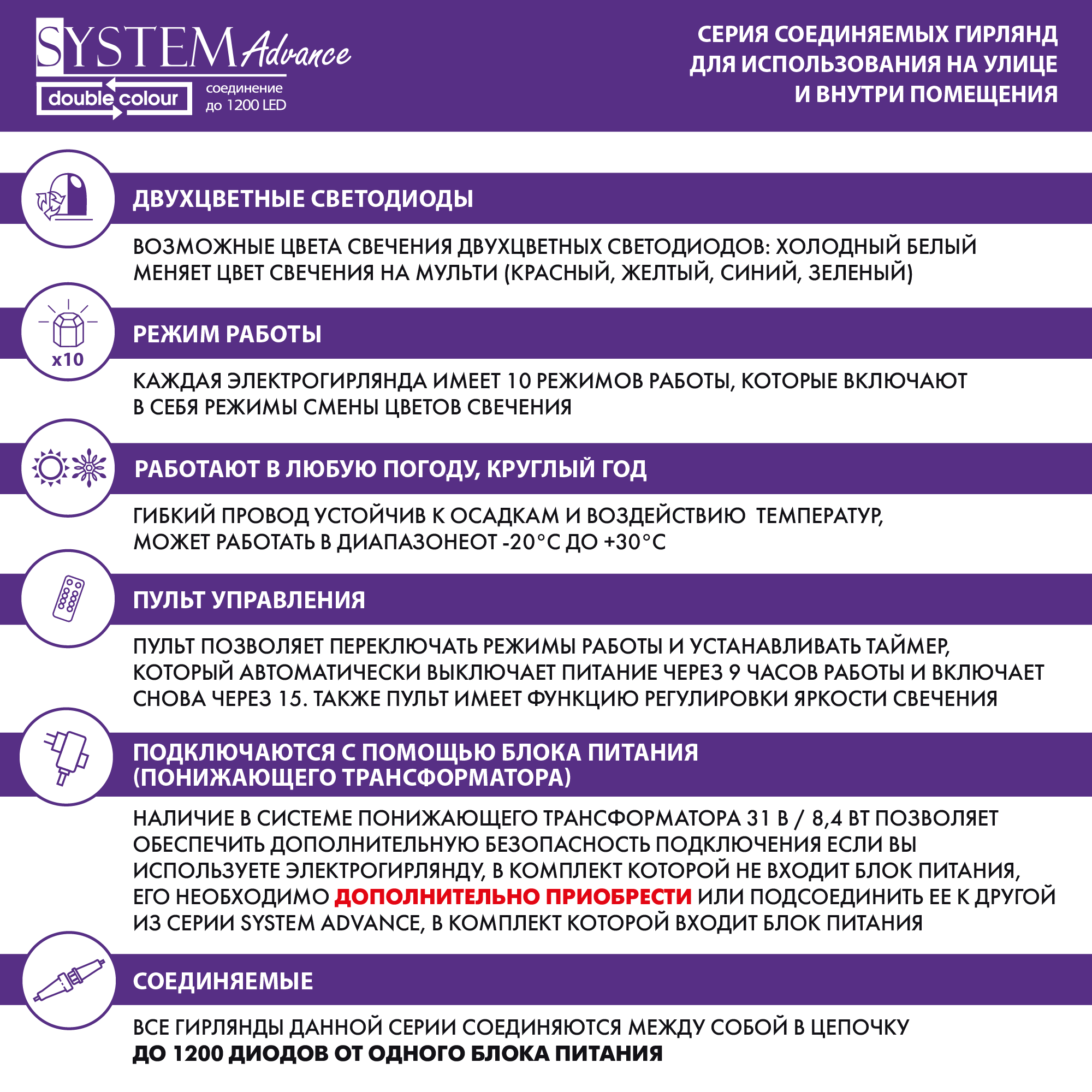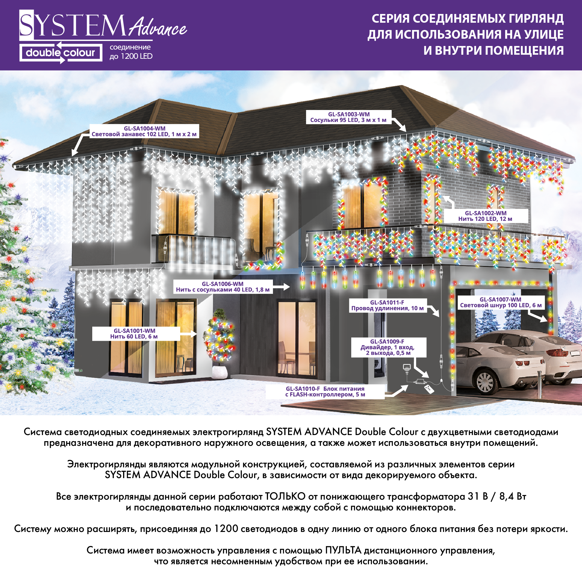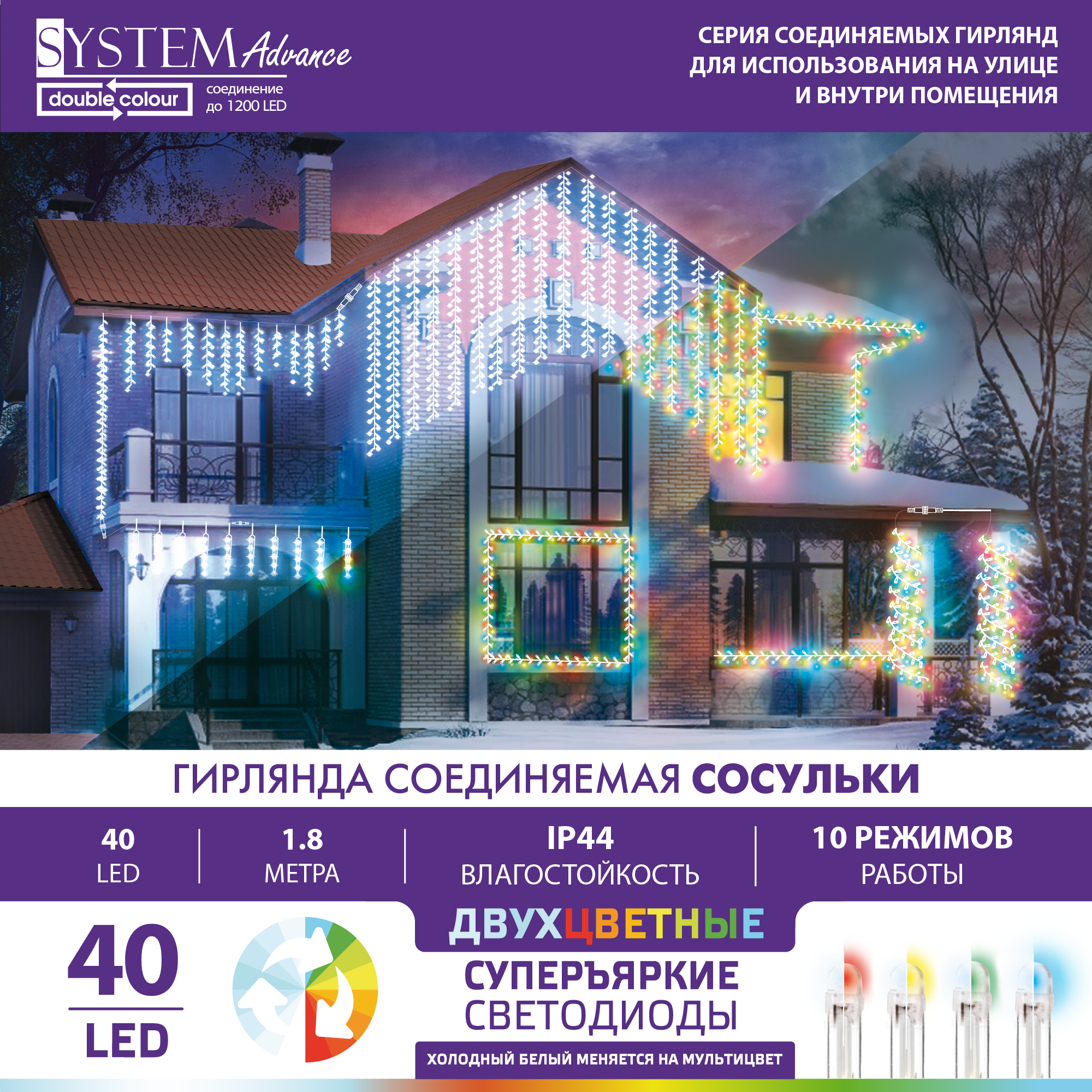Светодиодная новогодняя гирлянда для улицы Нить с Сосульками серии SYSTEM ADVANCE Double Colour. Уличное и домашнее декоративное освещение, и самая лучшая гирлянда для фото. У уличной гирлянды гибкий прозрачный провод, на котором расположены 8 насадок длиной 20 см каждая. Гирлянда занавес красивая и струящаяся, привлекает внимание, приносит новогоднее настроение. Идеально подходит в качестве гирлянды для террасы. 40 двухцветных led диодов яркие, потребляют в 10 раз меньше энергии, чем лампы накаливания и не нагреваются. Мульти свечение мягко и плавно сменяется на холодное белое в 10ти разных режимах мигания.Длина гирлянды для праздника: 1,8 м. Работает от сети. Блок питания и пульт управления НЕ входят в комплект! Их можно приобрести отдельно. Гирлянда на стену и остальные украшения из данной серии соединяются в цепочку до 1200 диодов без потери яркости. Все они работают только от трансформатора 31V.Эти украшения и декорации не боятся солнца, снега и дождя, влагостойкость IP44. Диапазон температур от -20С до +30С. Места крепления защищены от влаги. Украшайте дом, двор и сад в любое время года. Стильный подарок на Новый год, Рождество и в любой другой день.