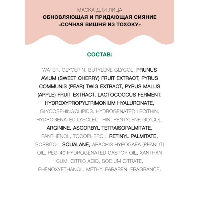| Состав | Water, Glycerin, Butylene Glycol, Sweet Cherry Fruit Extract, Pear Twig Extract, Apple Fruit Extract, Lactococcus Ferment, Hydroxypropyltrimonium Hyaluronate, Glycosphingolipids, Hydrogenated Lecithin, Hydrogenated Lysolecithin, Pentylene Glycol, Arginine, Ascorbyl Tetraisopalmitate, Panthenol, Tocopherol, Retinyl Palmitate, Sorbitol, Squalane, Peanut Oil, PEG-40 Hydrogenated Castor Oil, Xanthan Gum, Citric Acid, Sodium Citrate, Phenoxyethanol, Methylparaben, Fragrance |