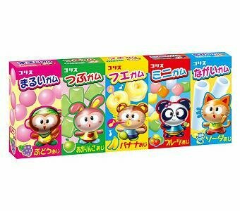 Пять коробочек жвачки с разными вкусами - виноград, яблоко, банан, фруктовый, лимонад.