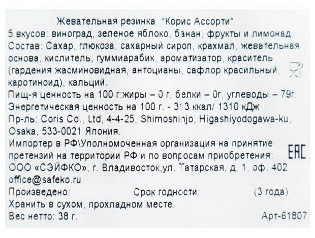 | Состав | Сахар, глюкоза, сироп, крахмал, жевательная основа, подкислитель, загустители, ароматизаторы, пищевые красители ( сафлор желтый, антоциан, гардения, каротиноид), фосфат кальция, осветлитель. |