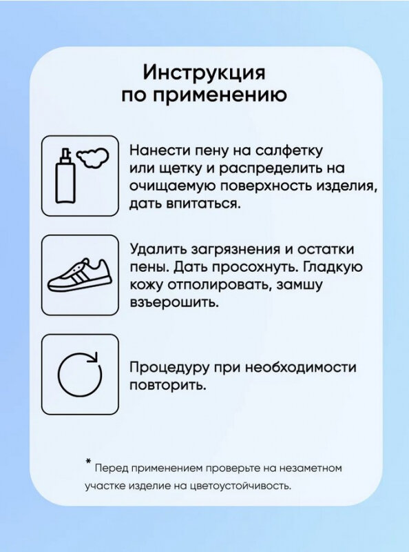 | Способ применения | Нанести пену на салфетку и равномерно распределить по изделию. Перед использованием проверить изделие на незаметном участке на цветоустойчивость. Рекомендуется использовать по мере загрязнения, а также перед нанесением красящих средств. |
