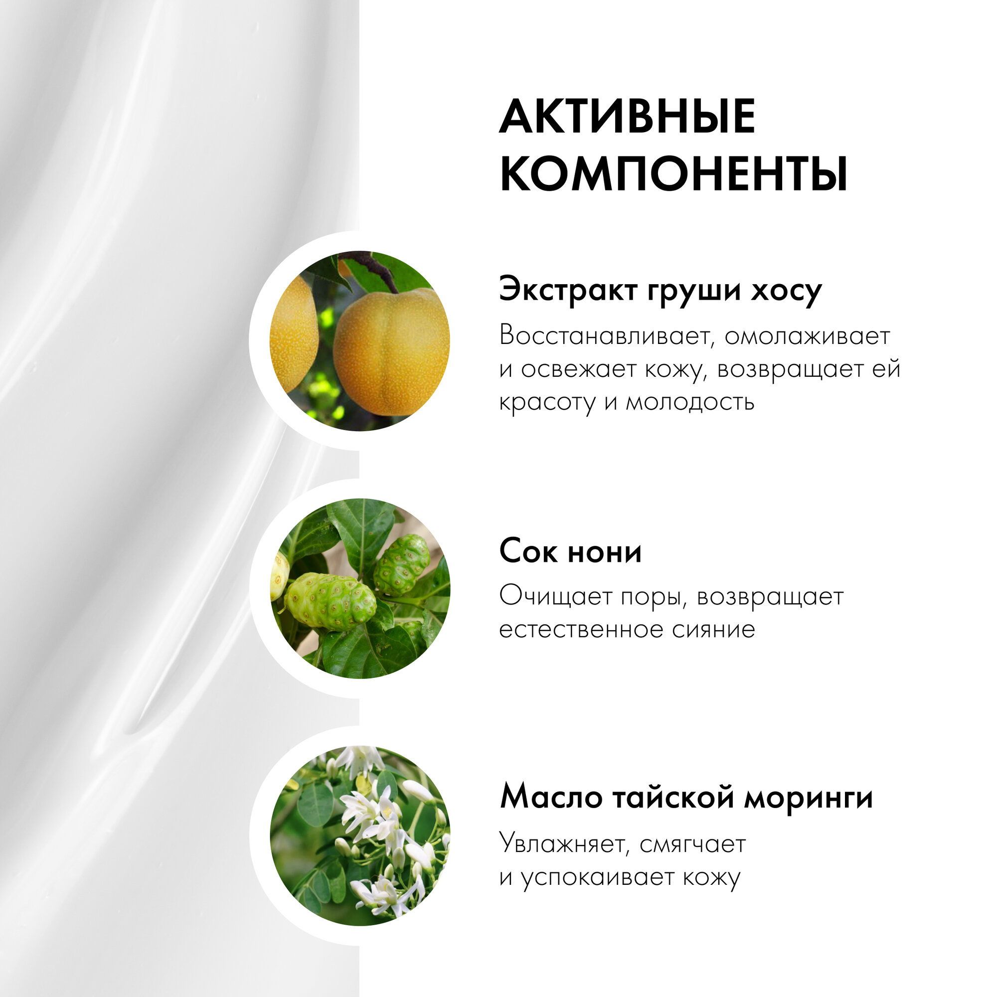 | Состав | aqua; coco-caprylate/caprate; glycerin; cetearyl alcohol; butyrospermum parkii butter (масло ши); helianthus annuus seed oil; niacinamide (витамин в3); pyrus communis fruit extract (органический экстракт груши хосу); morinda citrifolia fruit juice (сок нони); moringa oleifera seed oil (масло тайской моринги); prunus persica leaf extract (экстракт листьев персика); sodium stearoyl glutamate; sodium hyaluronate (гиалуроновая кислота); xantham gum; benzyl alcohol; sodium benzoate; potassium sorbate; dehydroacetic acid; citric acid; parfum; hexyl cinnamal |