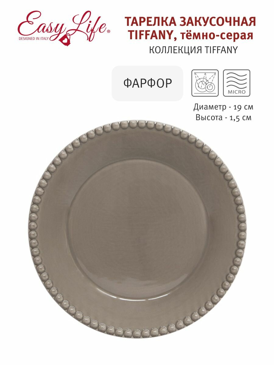 На сегодняшний день товар «Тарелка закусочная Tiffany 19 см серый EL-R2702-TIGD Easy life» можно купить с кешбеком в 1 магазине: Яндекс.Маркет