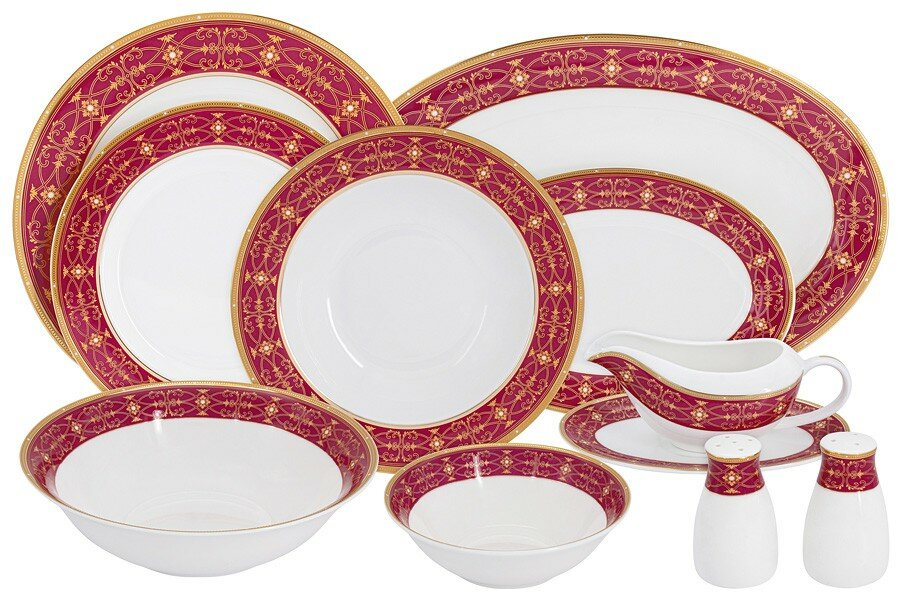 | Состав набора | обеденная тарелка - 12 шт; суповая тарелка - 12 шт; закусочная тарелка - 12 шт; салатник - 6 шт; блюдо - 5 шт; соусник - 1 шт; солонка - 1 шт; перечница - 1 шт |