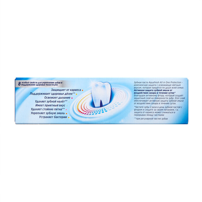Зубная паста Аквафреш All in One обладает 8 преимуществами в области защиты полости рта: защищает от кариеса, поддерживает здоровье десен, освежает дыхание, удаляет зубной налет, имеет приятный вкус, удаляет стойкие пятна, устраняет бактерии, обеспечивает комплексную защиту полости рта для всей семьи. Формула Sugar Acid Protection в составе пасты содержит фторид и помогает защитить зубы от пагубного воздействия кислот.