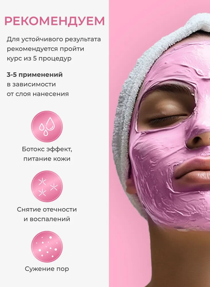 | Способ применения | Очистите кожу. В соотношении 1:1 разведите 20 грамм маски (4 мерных ложки) в 20 мл воды (2 мерных ложки) в емкости до однородной массы в соотношении. Сразу же наносите маску на лицо, шею и зону декольте до ее застывания. Оставьте маску на 20-30 минут до полного застывания. Снимите маску. Для устойчивого результата рекомендуется сделать курс из 5 процедур. Отмечай на шкале выполненные процедуры и наблюдай как твоя кожа преображается! |