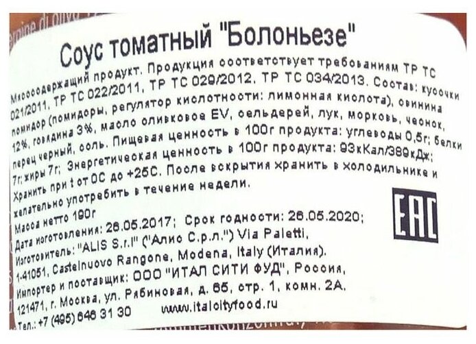 | Состав | Мякоть помидора, масло оливковое, свиное и говяжье мясо, лук, чеснок, морковь, черный перец, соль. |