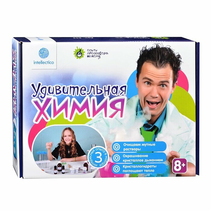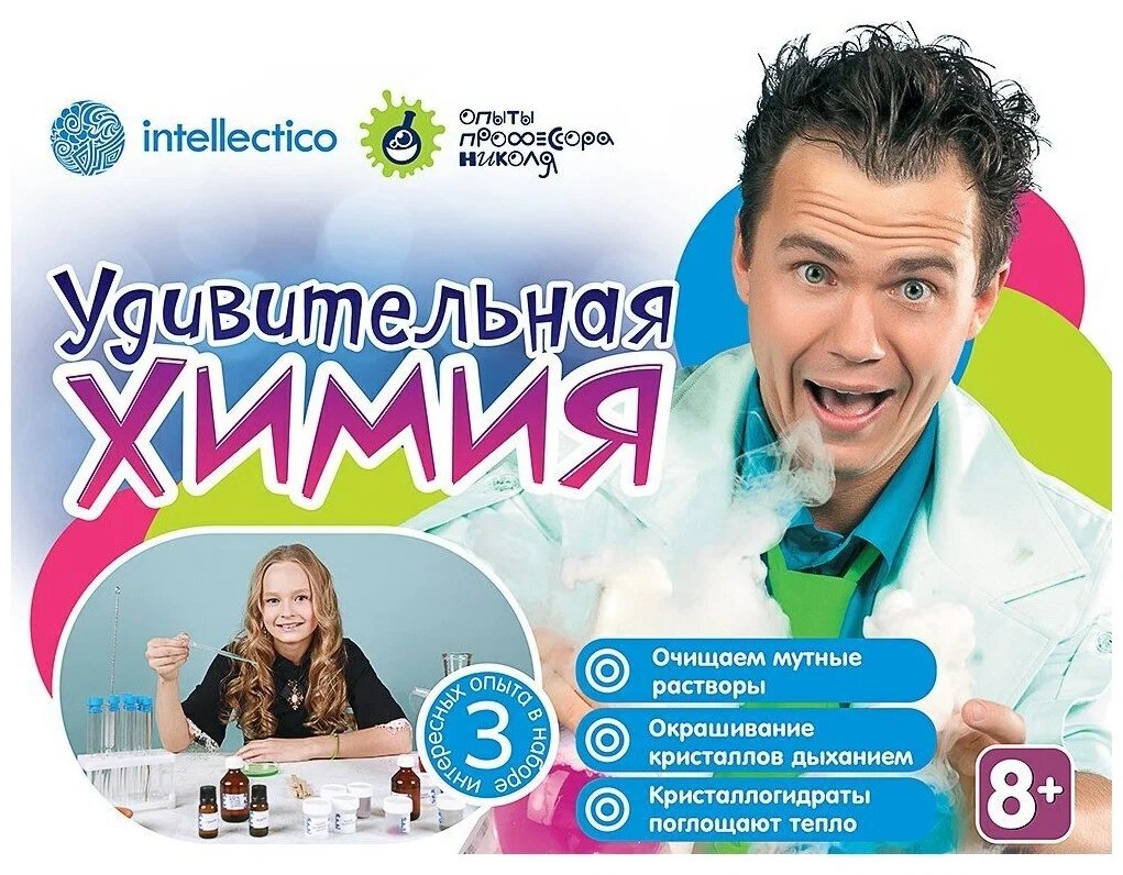 Набор для опытов Intellectico Удивительная химия рекомендован для детей старше 8 лет. Ребенок проведет 3 опыта: выращивание кристалла, окрашивание кристаллов дыханием и кристаллогидраты поглощают тепло.