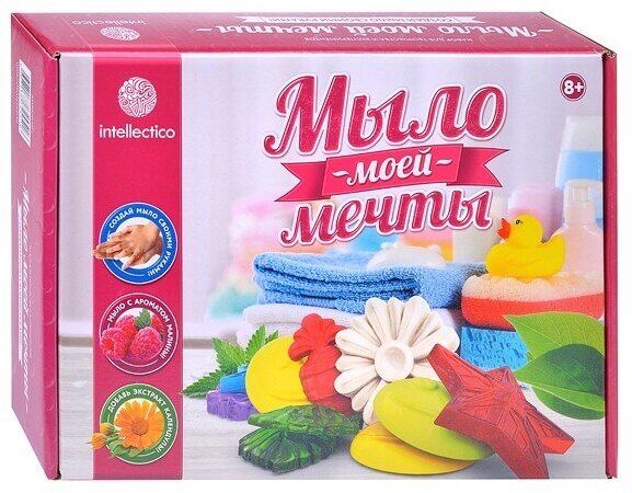 Intellectico Серия Мыло моей мечты - отличная альтернатива гигиеническому средству из магазина. Даже такой обычный предмет гигиены, как мыло, может стать изысканным подарком для родных и друзей, если сделать его своими руками. Познайте искусство мыловарения, прочитав подробную инструкцию, указания которой позволят будущему владельцу сделать разноцветное мыло, которое подарит не только хорошее настроение благодаря яркому цвету, но и будет бережно ухаживать за кожей.