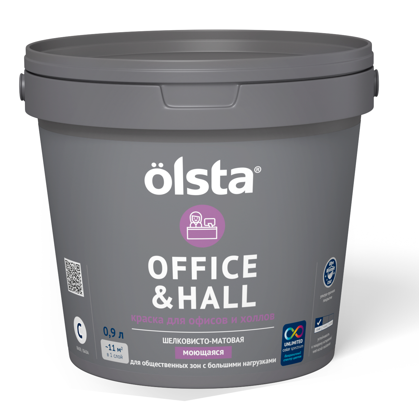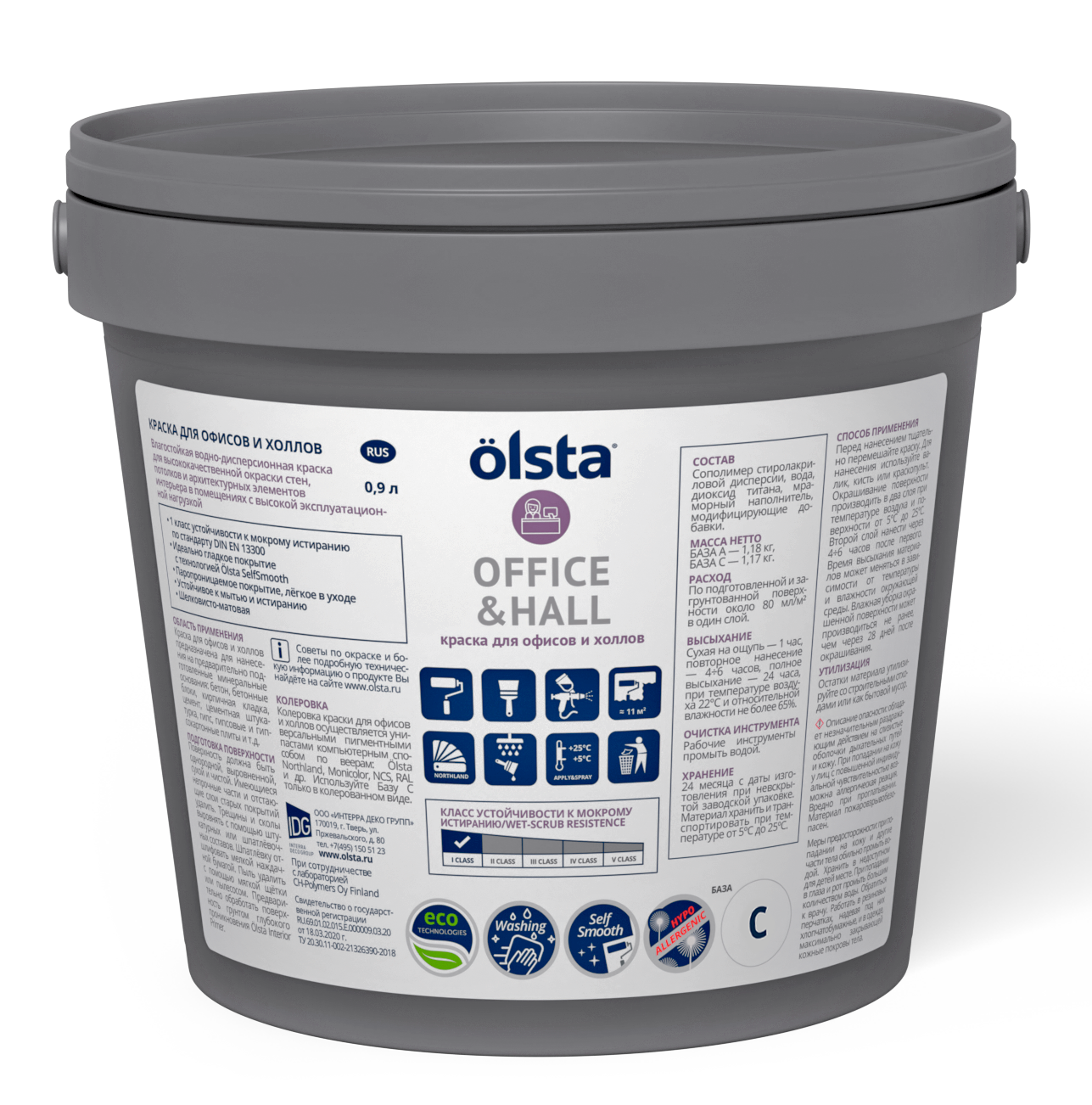 Шелковисто-матовая rраска для офисов и холлов Olsta Office&hall; База A. Предназначена для нанесения на предварительно подготовленные минеральные основания: бетон, бетонные блоки, кирпичная кладка, цемент, цементная штукатурка, гипс, гипсовые и гипсокартонные плиты.Обладает первым классом устойчивости к мокрому истиранию по стандарту DIN EN 13 300. Благодаря технологии Olsta Selfsmooth создает идеально гладкое покрытие. Паропроницаема, легка в уходе. Устойчива к мытью и истиранию.