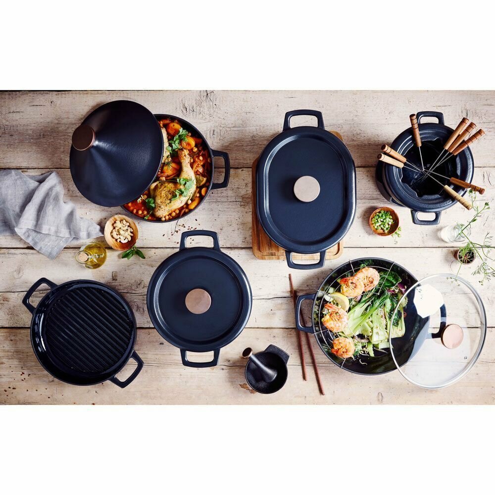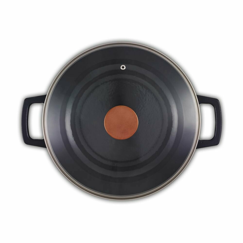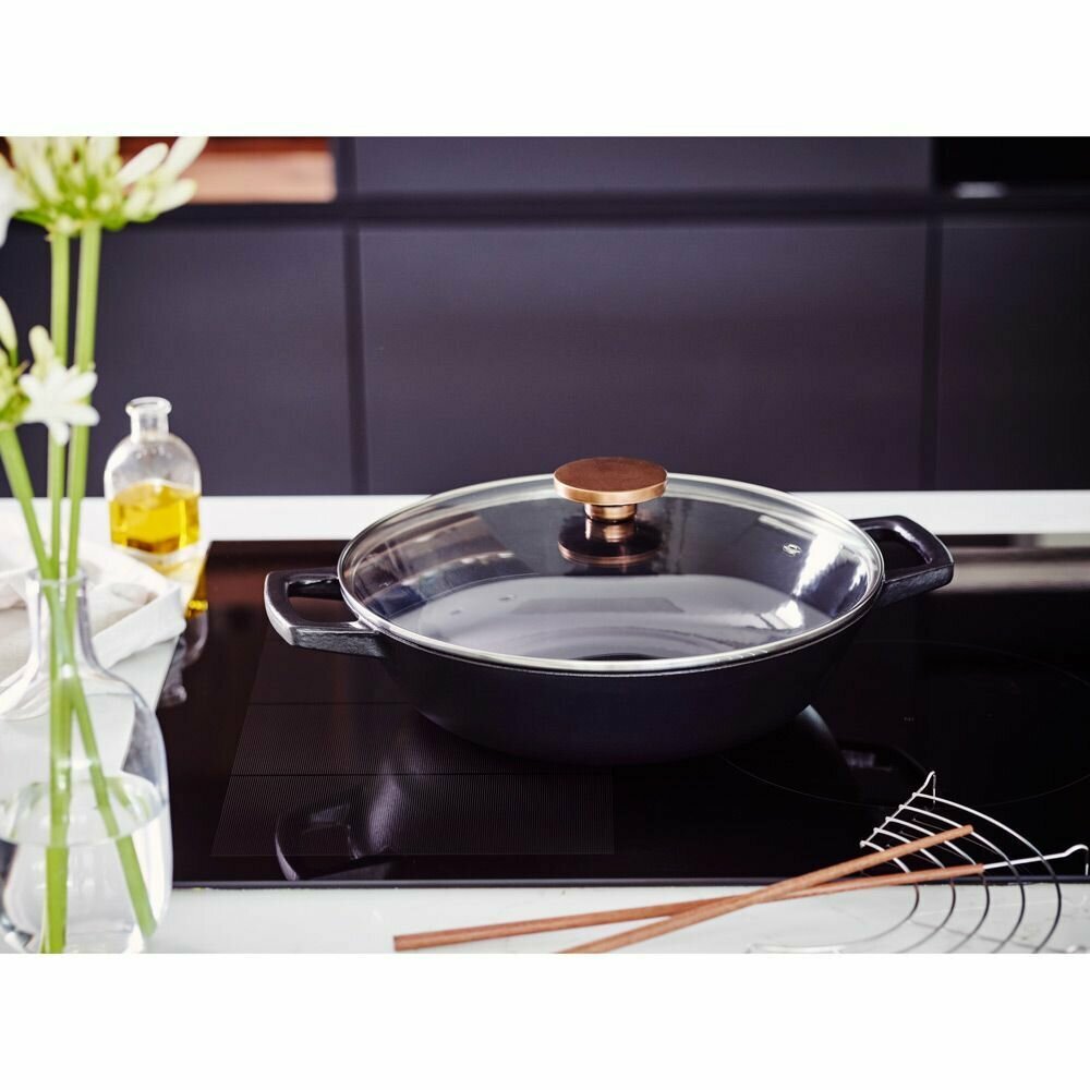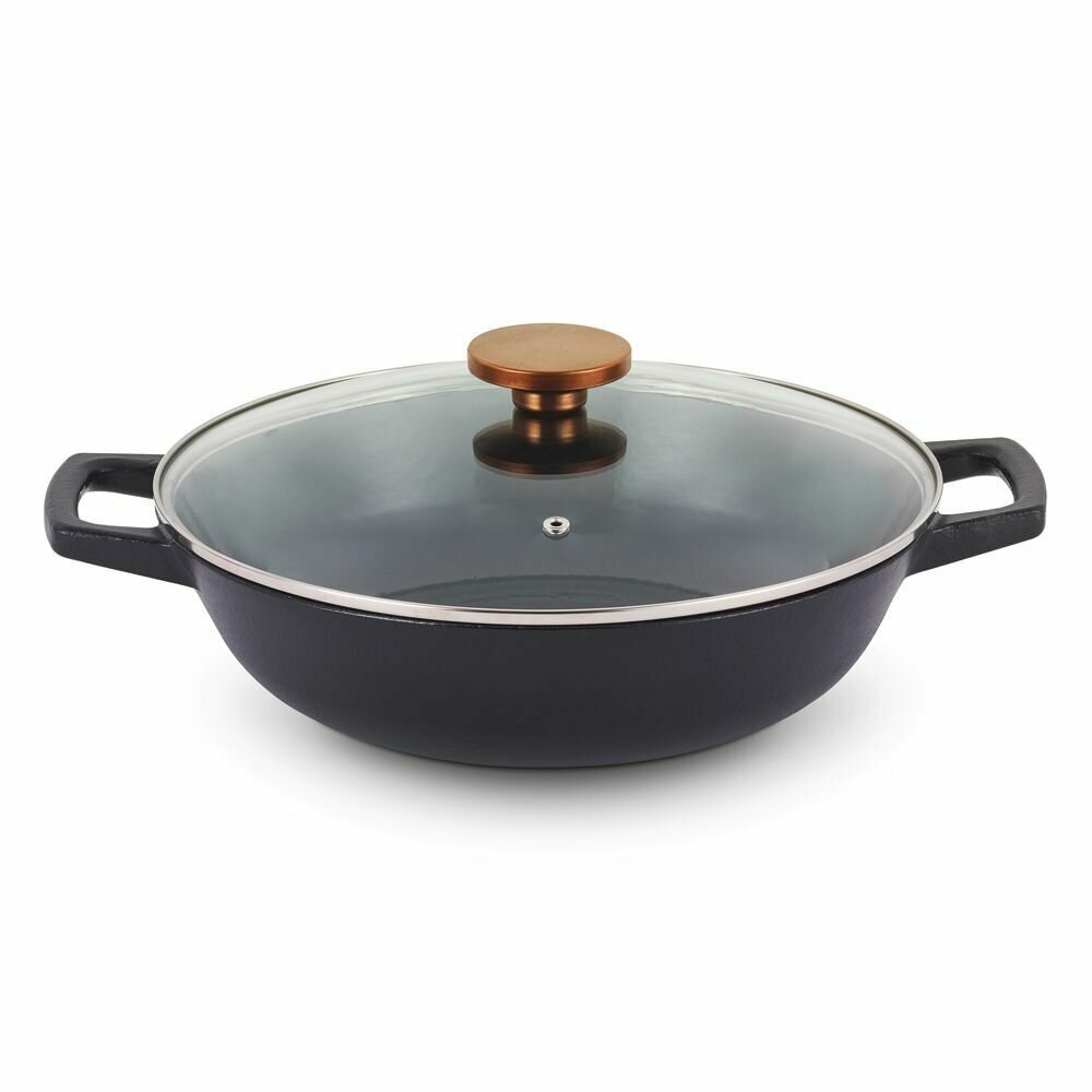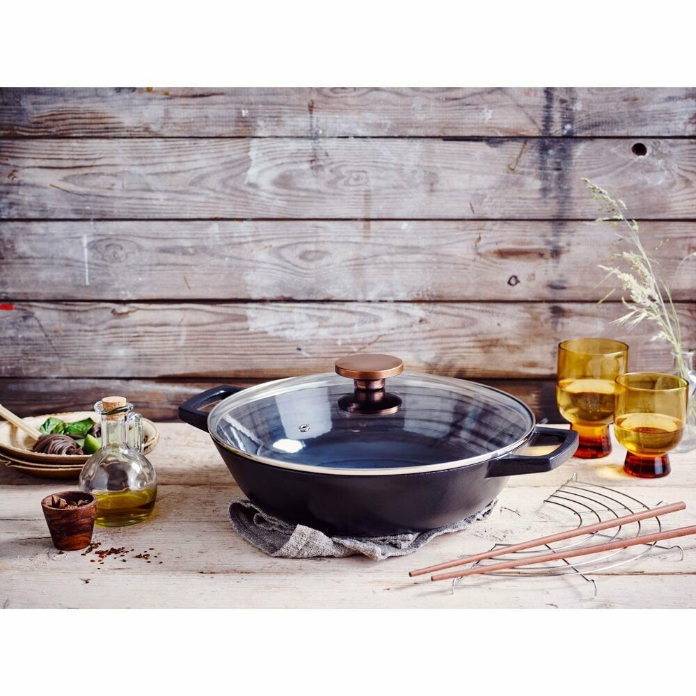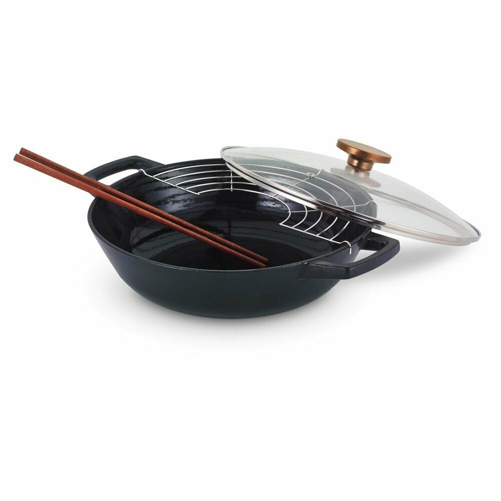Толщина корпуса – 4 мм, толщина дна – 4 мм. Всегда актуальный дизайн – стильное изделие из чугуна с красивой бронзовой ручкой будет эффектно смотреться в интерьере Вашей кухни и украсит любой стол. Прочный долговечный чугун имеет отличную теплопроводность и держит тепло в течение длительного времени. Внутренняя и внешняя поверхности изделия покрыты тремя слоями эмали, что позволяет использовать его без предварительной подготовки. Толстое эмалевое покрытие имеет высокую устойчивость к царапинам, благодаря чему вок легко моется и прост в уходе. Две ручки позволяют удобно и надежно держать изделие в руке. Прозрачная стеклянная крышка дает возможность наблюдать за процессом приготовления. Паровыпускное отверстие предотвращает сильное кипение и дребезжание крышки. В комплект входят аксессуары: решетка и палочки для еды.