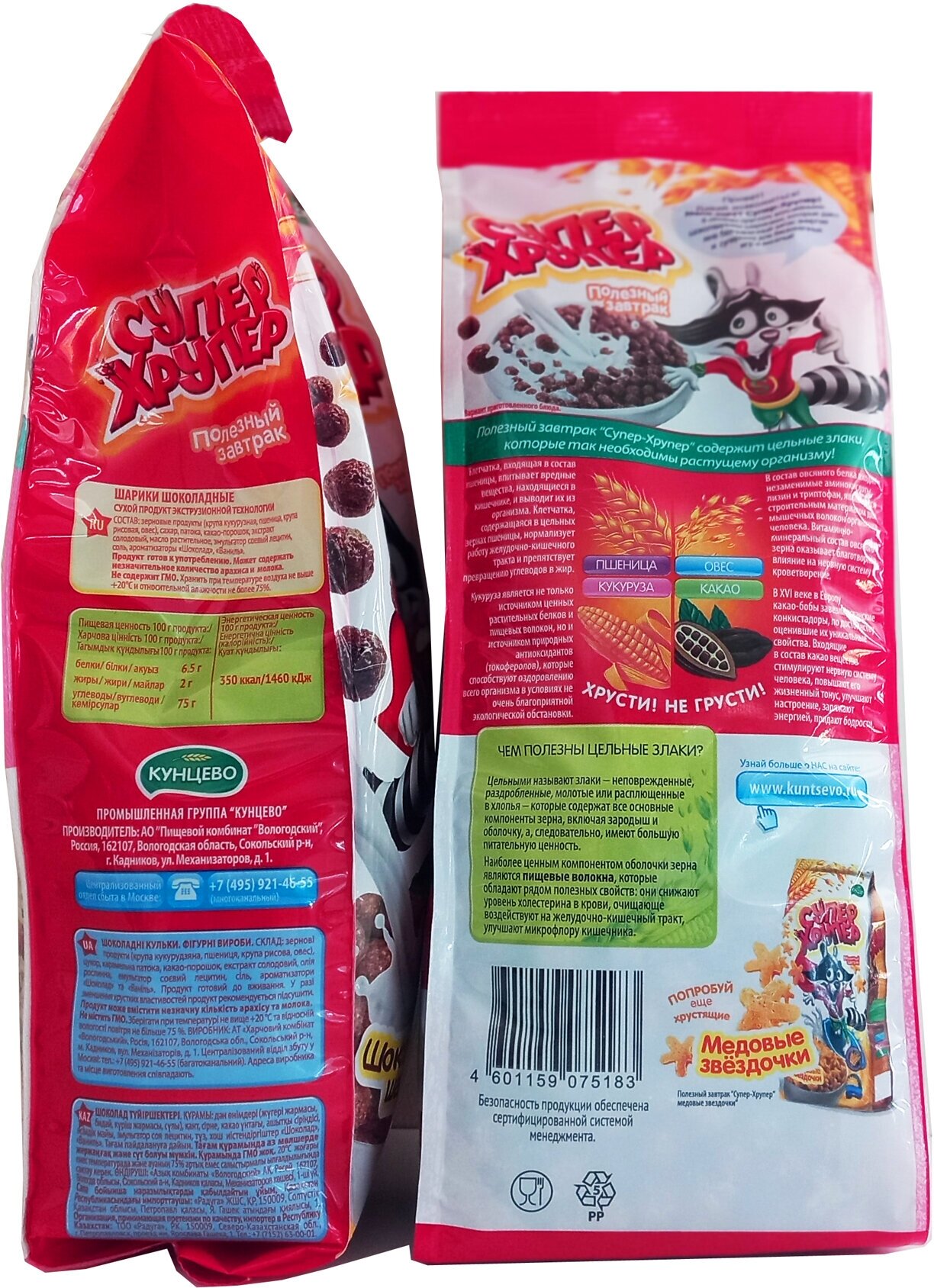 | Состав | Зерновые продукты (кукурузная крупа, пшеница, овес, крупа рисовая), сахар, патока, какао-порошок, кокосовое масло, экстракт солодовый, соль пищевая поваренная, лецитин, ароматизаторы, идентичные натуральным (шоколад, ваниль), продукт может содержать незначительное количество арахиса и молока |