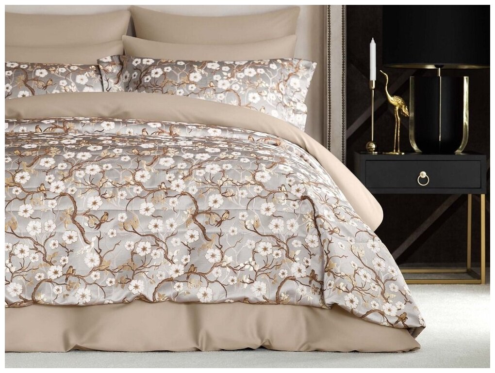 «Киото» выполнено в знаменитом стиле шинуазри. Восточная изысканность и средневековое китайское искусство в европейской интерпретации – вот основа этого дизайна. Ткань, стилизованная под полотна китайского шелка, отсылает нас в цветущий сад с птицами на ветвях. Характерный орнамент на основе китайских мотивов включает всего три цвета: благородный серебристый оттенок – фон покрывала, белые бутоны и цветы, коричневые ветви в саду. Вплетение золотых нитей в узор «Киото» придает ему нарядный вид. В комплекте с покрывалом представлены две наволочки для декоративных подушек.