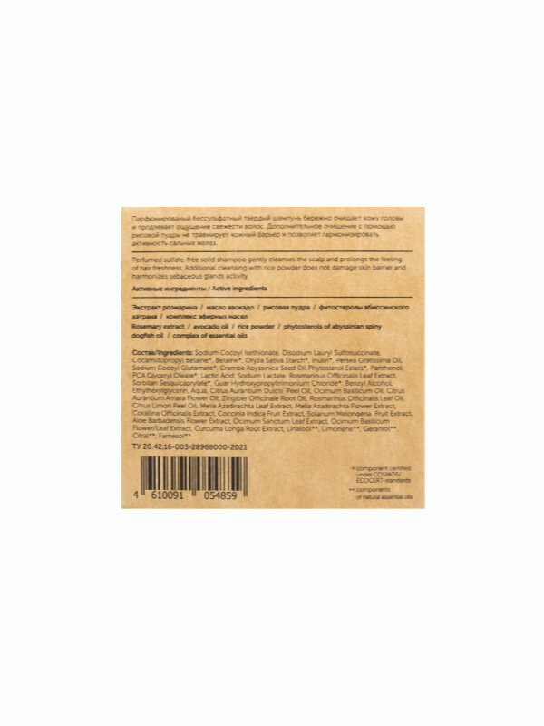 | Химический состав | Sodium Cocoyl Isethionate, Disodium Lauryl Sulfosuccinate, Cocamidopropyl Betaine*, Betaine*, Oryza Sativa Starch*, Inulin*, Persea Gratissima Oil, Sodium Cocoyl Glutamate*, Crambe Abyssinica Seed Oil Phytosterol Esters*, Panthenol, PCA Glyceryl Oleate*, Lactic Acid, Sodium Lactate, Rosmarinus Officinalis Leaf Extract, Sorbitan Sesquicaprylate*, Guar Hydroxypropyltrimonium Chloride*, Benzyl Alcohol, Ethylhexylglycerin, Aqua, Citrus Aurantium Dulcis Peel Oil, Ocimum Basilicum Oil, Citrus Aurantium Amara Flower Oil, Zingiber Officinale Root Oil, Rosmarinus Officinalis Leaf Oil, Citrus Limon Peel Oil, Melia Azadirachta Leaf Extract, Melia Azadirachta Flower Extract, Corallina Officinalis Extract, Coccinia Indica Fruit Extract, Solanum Melongena Fruit Extract, Aloe Barbadensis Flower Extract, Ocimum Sanctum Leaf Extract, Ocimum Basilicum Flower/Leaf Extract, Curcuma Longa Root Extract, Linalool**, Limonene**, Geraniol**, Citral**, Farnesol**. *компоненты эфирных масел. |