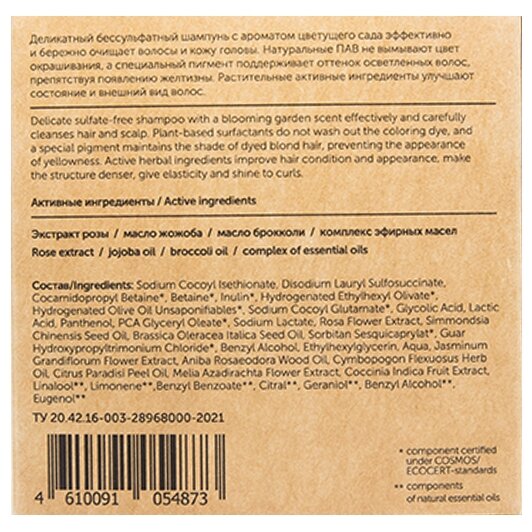 | Химический состав | Sodium Cocoyl Isethionate, Disodium Lauryl Sulfosuccinate, Cocamidopropyl Betaine*, Betaine*, Inulin*, Hydrogenated Ethylhexyl Olivate*, Hydrogenated Olive Oil Unsaponifiables*, Sodium Cocoyl Glutamate*, Glycolic Acid, Lactic Acid, Panthenol, PCA Glyceryl Oleate*, Sodium Lactate, Rosa Flower Extract, Simmondsia Chinensis Seed Oil, Brassica Oleracea Italica Seed Oil, Sorbitan Sesquicaprylat*, Guar Hydroxypropyltrimonium Chloride*, Benzyl Alcohol, Ethylhexylglycerin, Aqua, Jasminum Grandiflorum Flower Extract, Aniba Rosaeodora Wood Oil, Cymbopogon Flexuosus Herb Oil, Citrus Paradisi Peel Oil, Melia Azadirachta Flower Extract, Coccinia Indica Fruit Extract, Linalool**, Limonene**,Benzyl Benzoate**, Citral**, Geraniol**, Benzyl Alcohol**, Eugenol**. *компоненты эфирных масел |