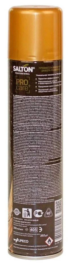 | Способ применения | Очистите поверхность изделия. При необходимости нанесите средство по уходу за обувью (Крем, Краска). Перед применением проверьте на незаметном месте изделия. Встряхните баллон. Интенсивно нанесите средство с расстояния 20-25 см, держа баллон вертикально, распылителем вверх. Для максимального эффекта дайте высохнуть в течение нескольких часов. В сырую и влажную погоду рекомендуется ежедневное применение. Не использовать для лаковых кож. |