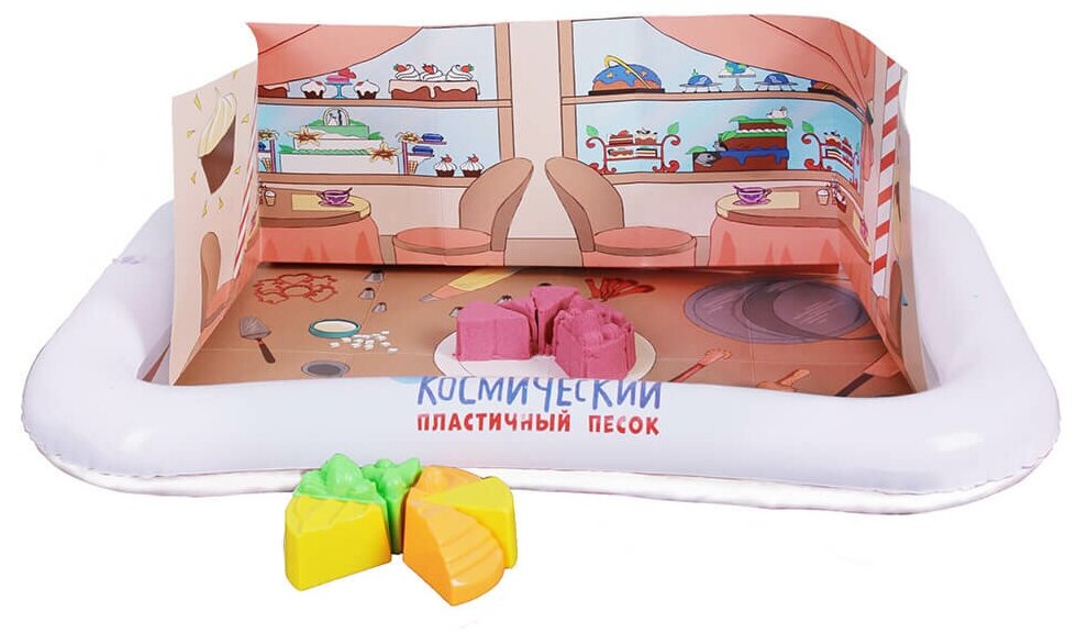 | Комплектация | 1 х Упаковка розового песка (1 кг) 1 х Большая надувная песочница 6 х Формочек для лепки тортов 1 х Настольная трехмерная игра 1 х Книжка с развивающими играми и пошаговыми инструкциями создания фигурок |