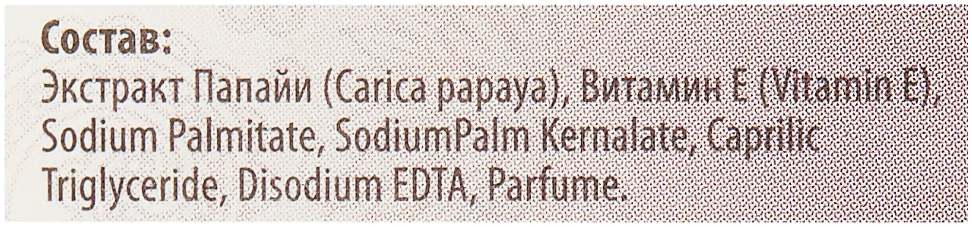 | Состав | Экстракт папайи, Витамин Е, Sodium Palmitate, Sodium Palm Kernalate, Cfprilic Triglyceride, Disodium EDTA, Parfume. |