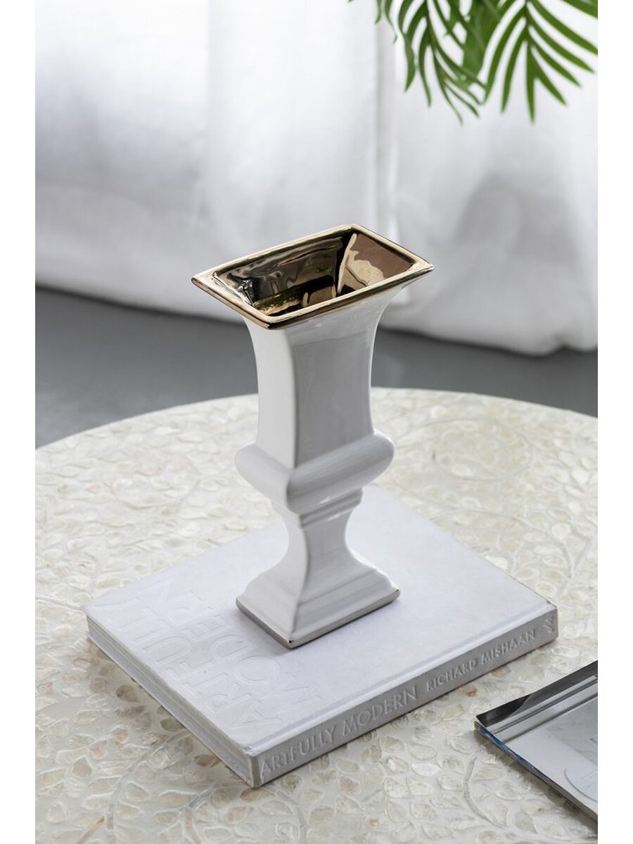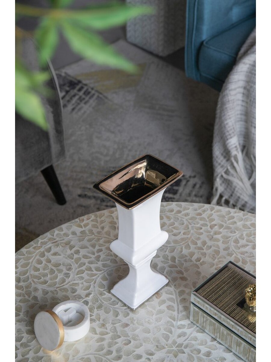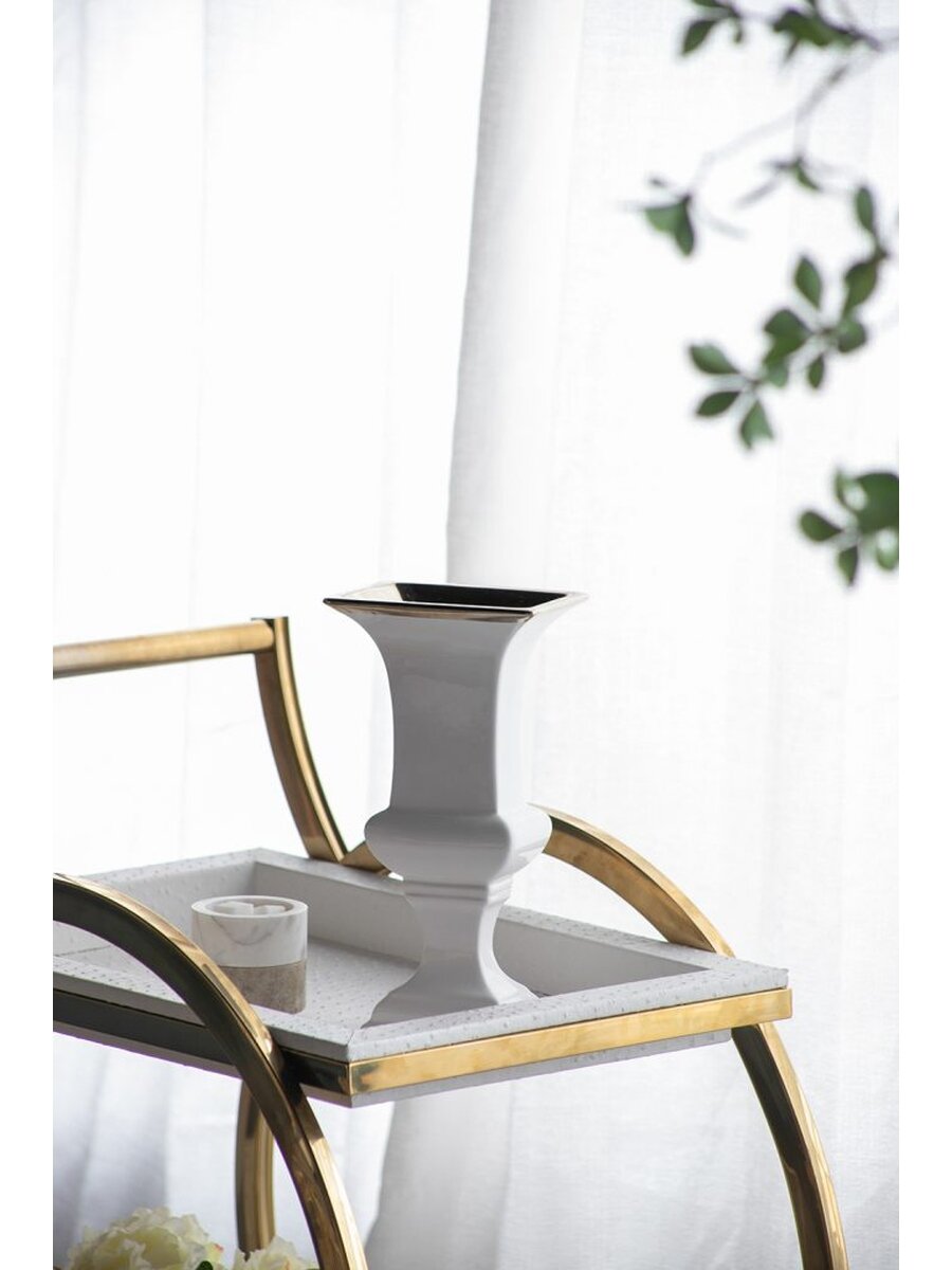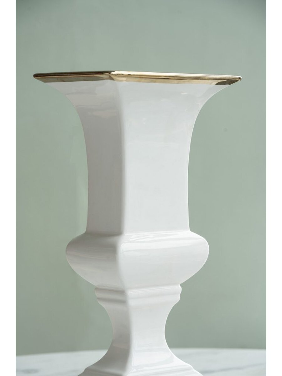 Сочетание классического дизайна и элегантной простоты - это всегда беспроигрышный вариант. Эта высокая ваза на ножке идеально подойдет для шикарного офиса или стильной гостиной. Золотая отделка на идеально белой поверхности смотрится дорого и стильно.