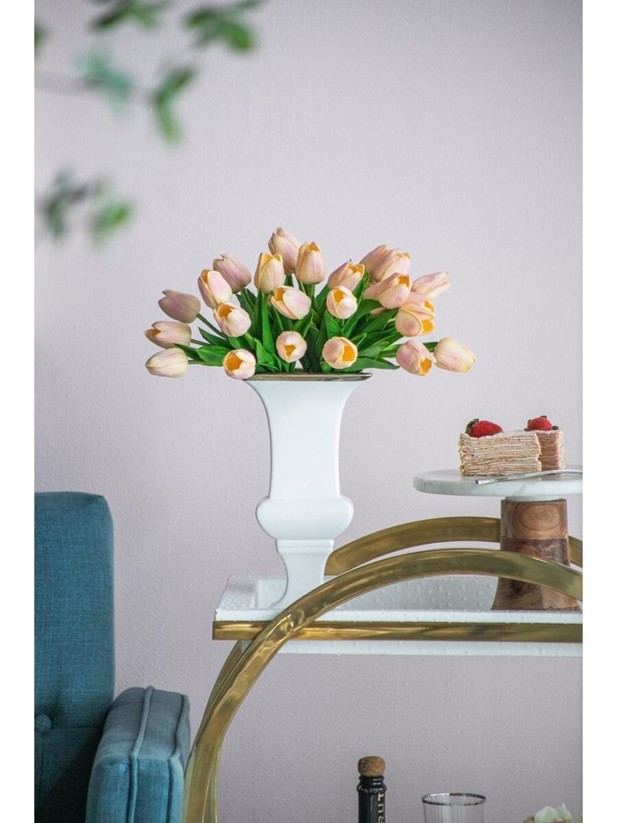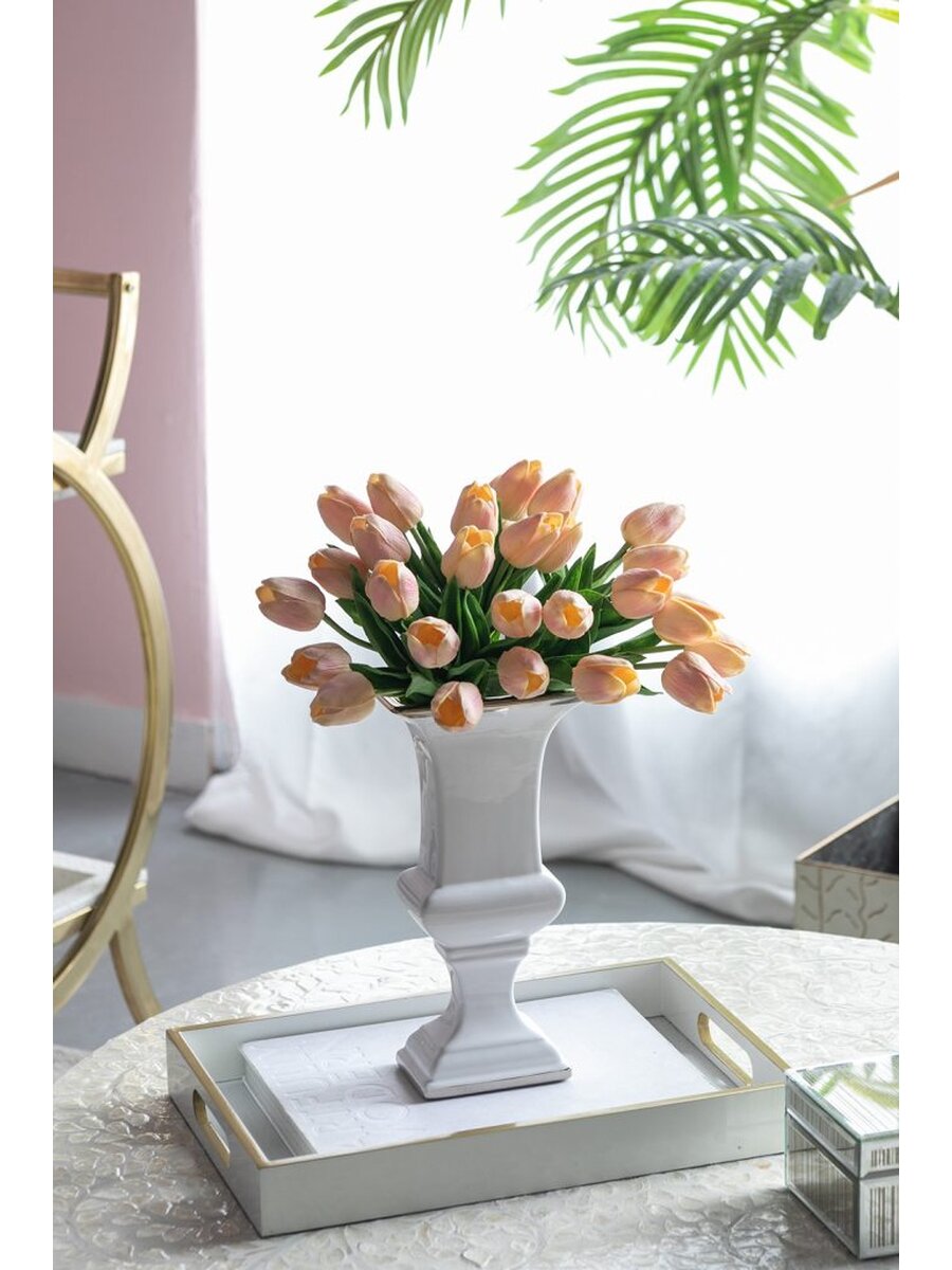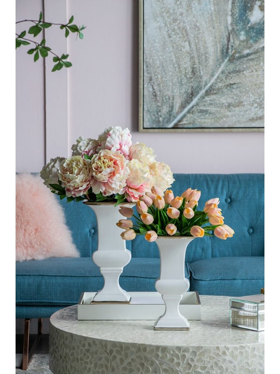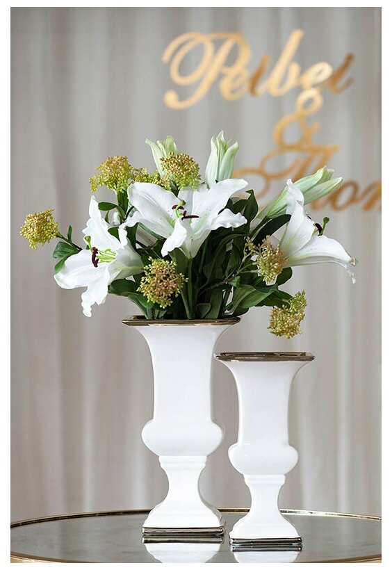 Сочетание классического дизайна и элегантной простоты - это всегда беспроигрышный вариант. Эта высокая ваза на ножке идеально подойдет для шикарного офиса или стильной гостиной. Золотая отделка на идеально белой поверхности смотрится дорого и стильно.