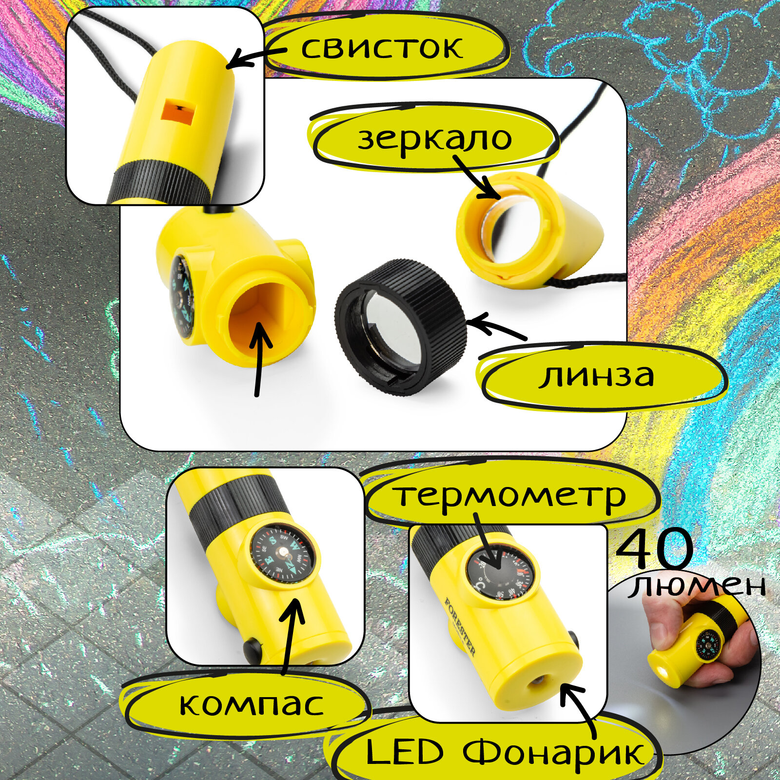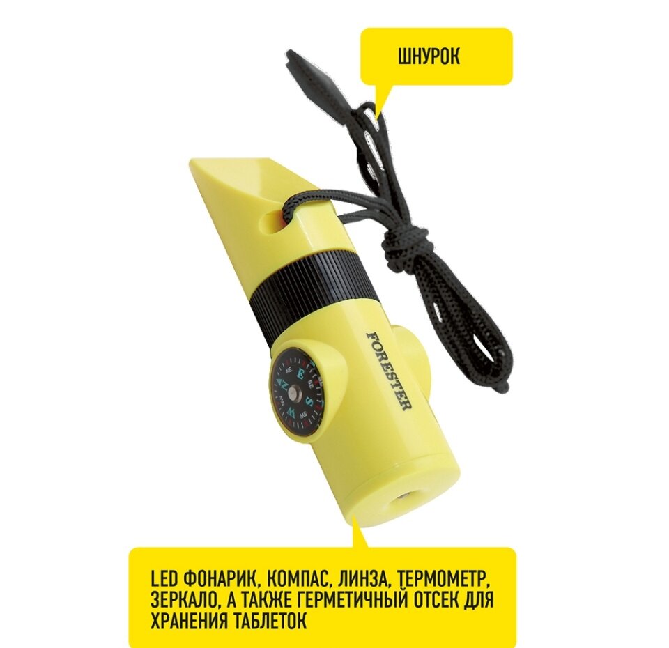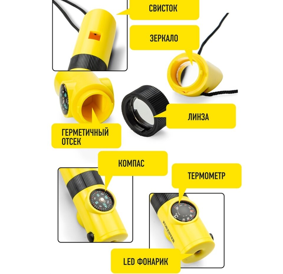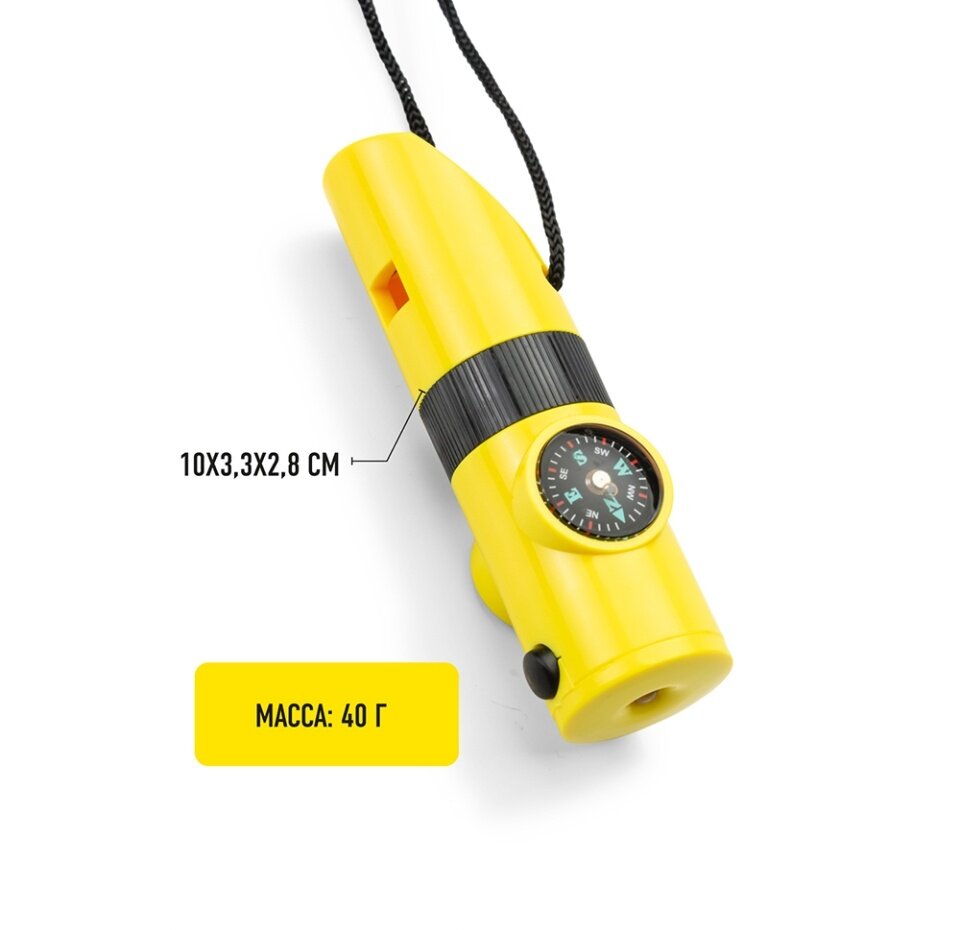 Многофункциональный прибор представляет собой свисток, в который встроены LED фонарик, компас, линза, термометр, зеркало, а также герметичный отсек для хранения таблеток для обеззараживания воды.Подходит для походов за грибами, рыбалки, туризма и другого активного отдыха. Фонарик LED (40 люмен) работает от двух батареек CR 1220.Отработанные батарейки необходимо утилизировать в специальные контейнеры в пунктах приема.Рекомендация: для разжигания огня воспользуйтесь линзой, через которую поймайте солнечный луч, направив его на "гнездо" растопки (стружки, коры, трута из сухих листьев, мха).