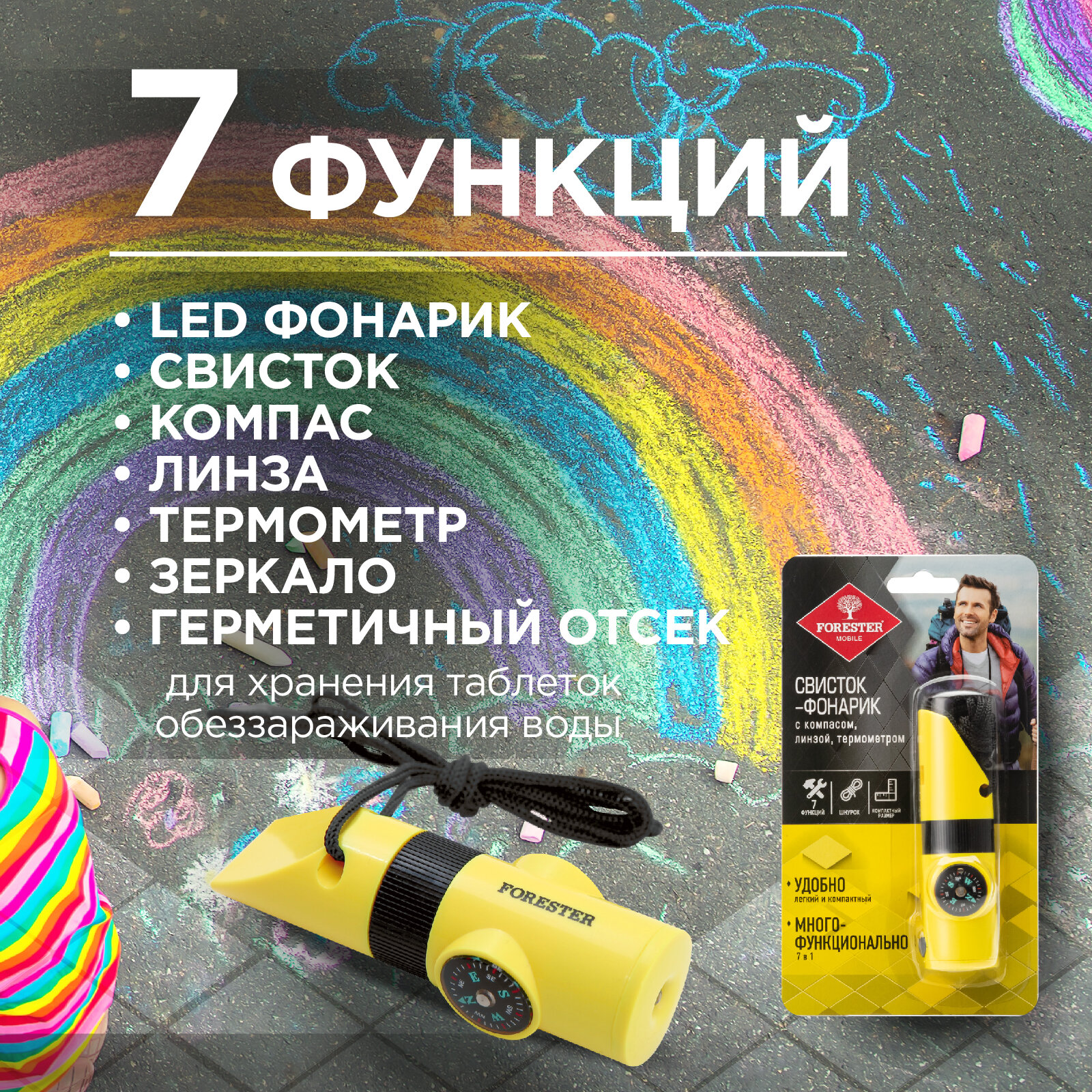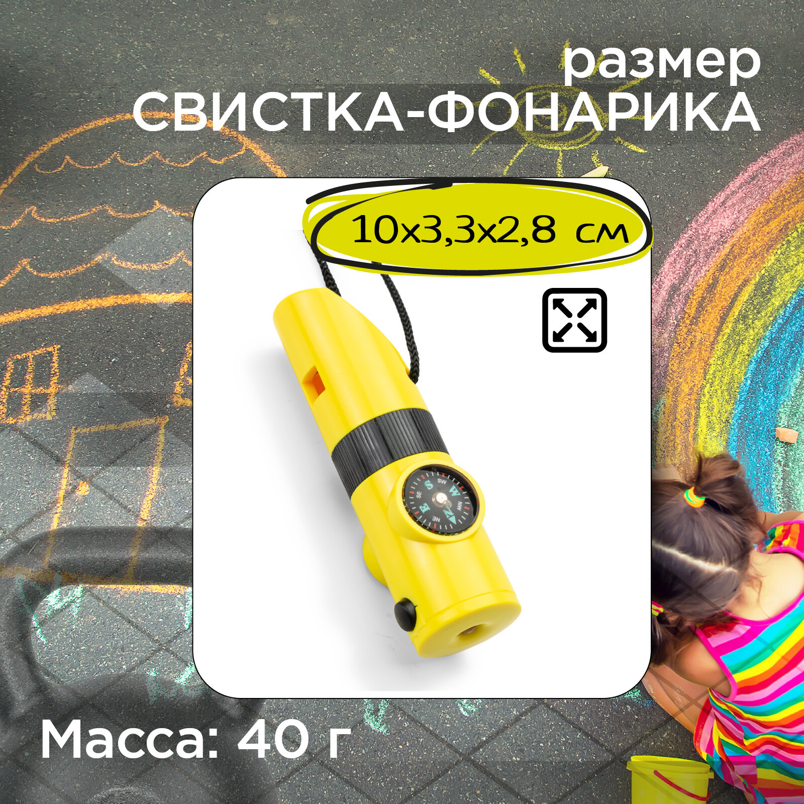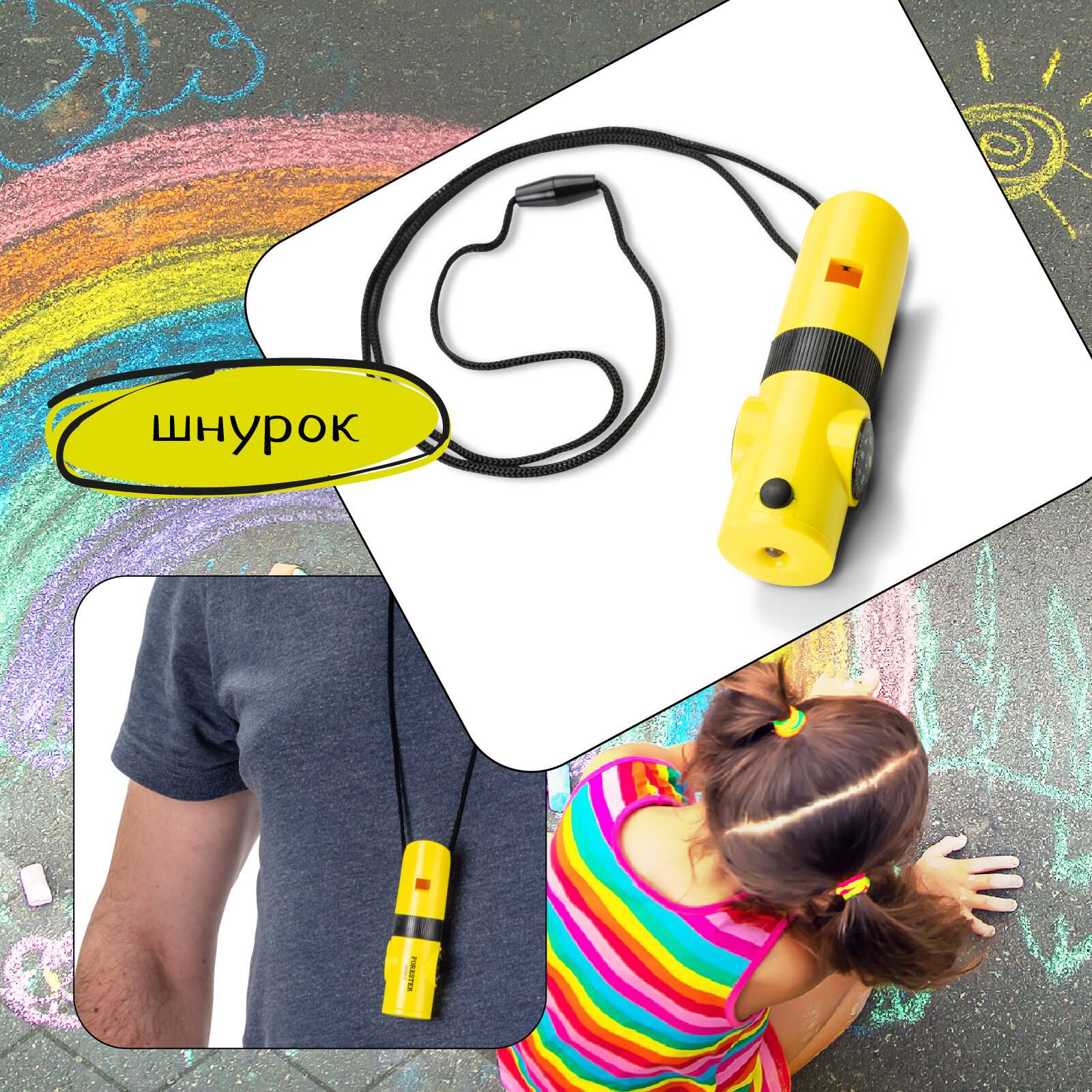 Многофункциональный прибор представляет собой свисток, в который встроены LED фонарик, компас, линза, термометр, зеркало, а также герметичный отсек для хранения таблеток для обеззараживания воды.Подходит для походов за грибами, рыбалки, туризма и другого активного отдыха. Фонарик LED (40 люмен) работает от двух батареек CR 1220.Отработанные батарейки необходимо утилизировать в специальные контейнеры в пунктах приема.Рекомендация: для разжигания огня воспользуйтесь линзой, через которую поймайте солнечный луч, направив его на "гнездо" растопки (стружки, коры, трута из сухих листьев, мха).