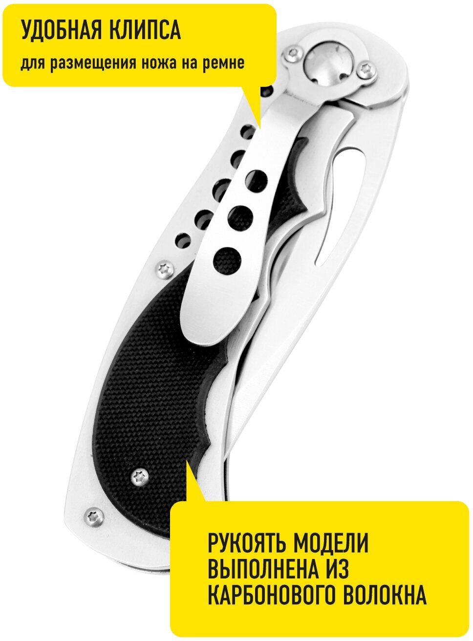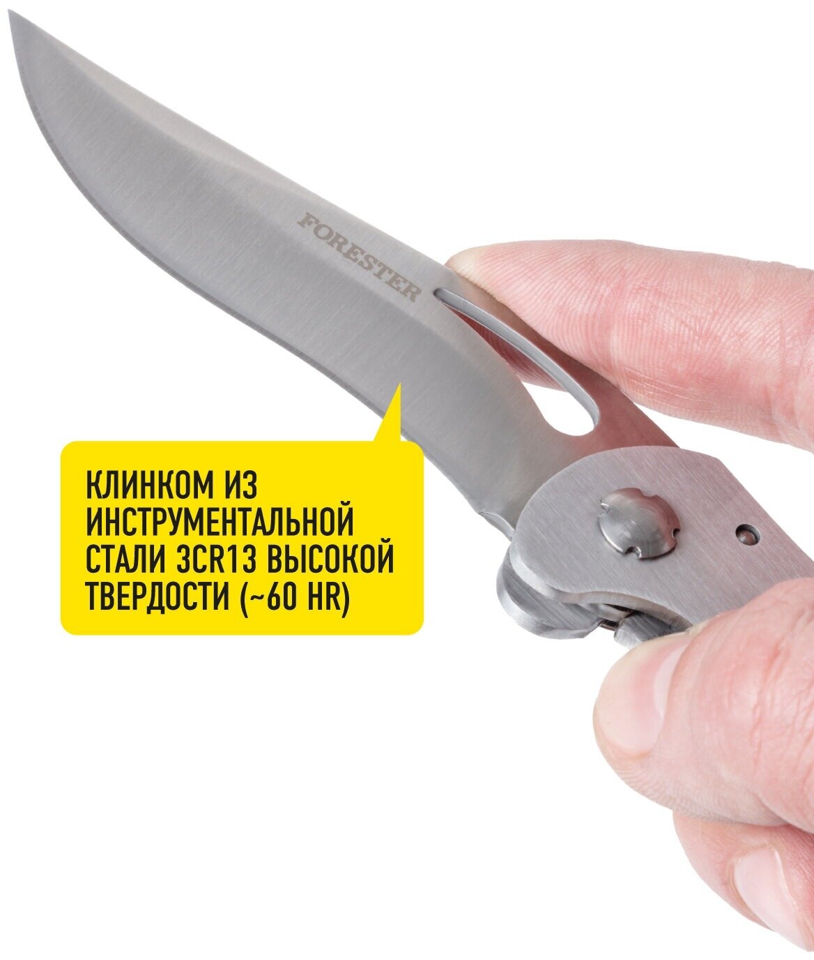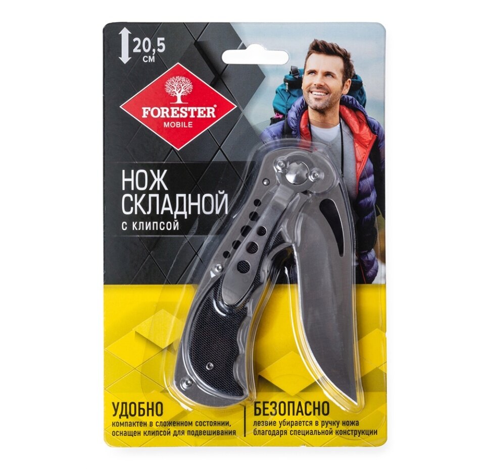 Складной универсальный нож с клипсой Forester MOBILE 20.5см OEC-5 оснащен клинком из инструментальной стали 3Cr13 высокой твердости (~60 HR).Хороший рез лезвия обеспечен высокими спусками скандинавского типа.Узкое острие гарантирует качественное выполнение мелкой работы, требующей точности.Рукоять модели выполнена из карбонового волокна.Нож удобно раскладывается благодаря специальному отверстию в клинке.Подходит для туристов, охотников, рыбаков и других любителей активного отдыха.